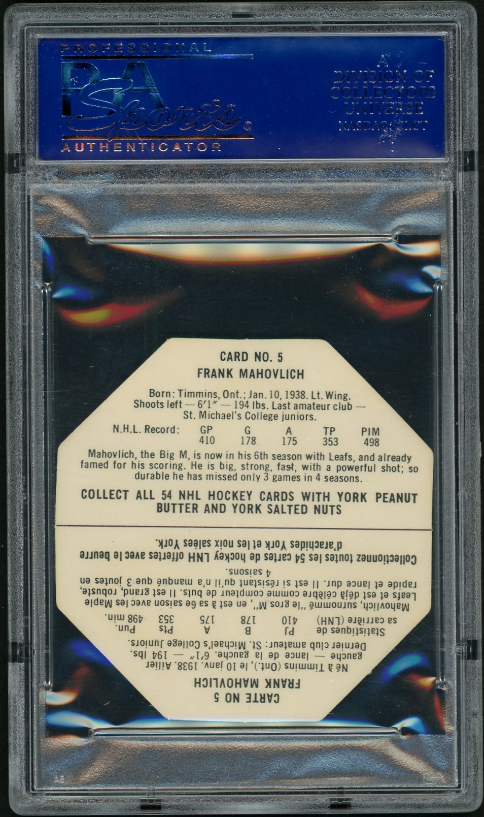 Absolutely stunning example of this 1963 York “White Back” featuring Hall of Famer, Frank Mahovlich. Issued with York Peanut Butter and Salted Nuts products, known for their unique octagon shape. This is 1 of 14, with only 2 graded higher among the 36 graded by PSA.