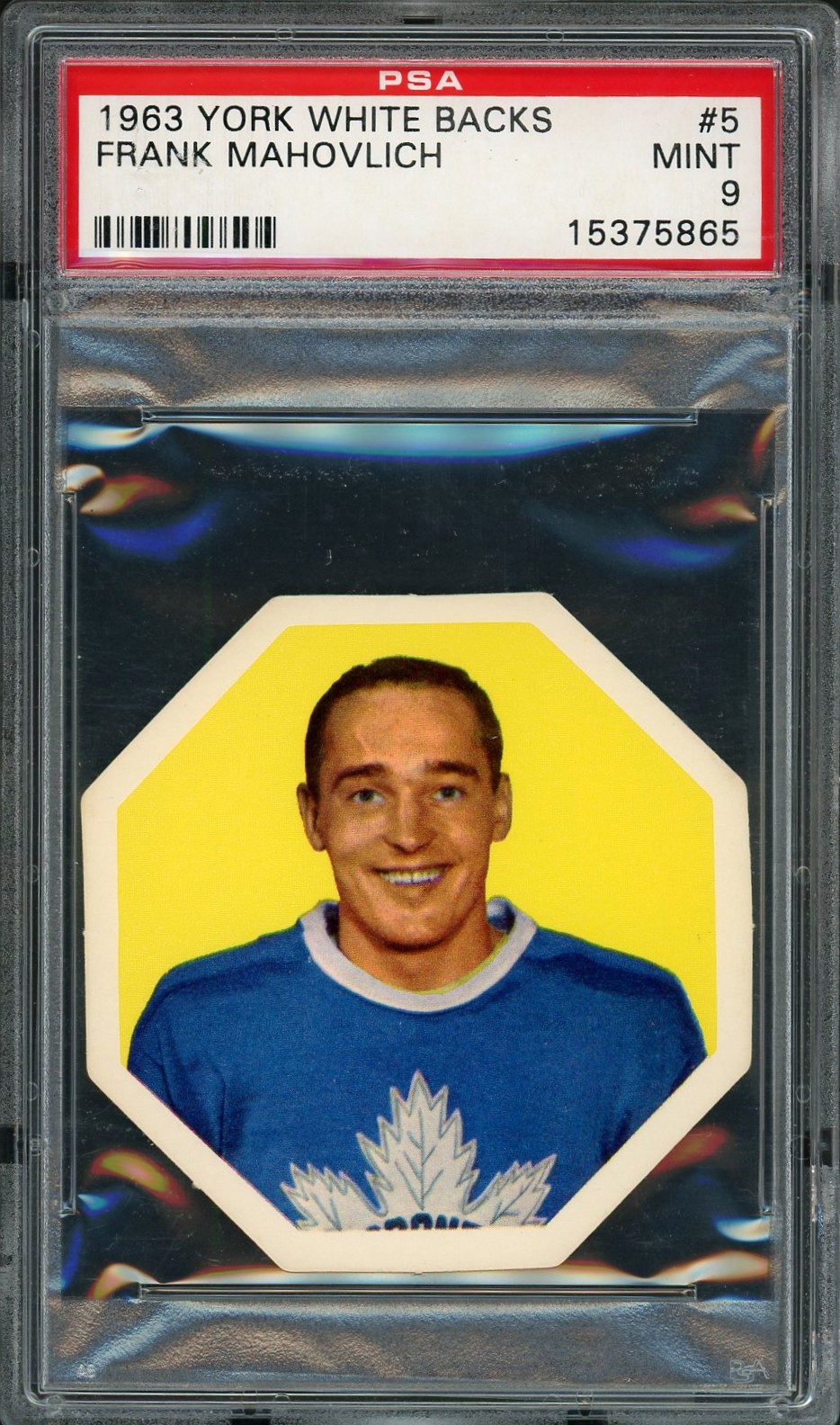 Absolutely stunning example of this 1963 York “White Back” featuring Hall of Famer, Frank Mahovlich. Issued with York Peanut Butter and Salted Nuts products, known for their unique octagon shape. This is 1 of 14, with only 2 graded higher among the 36 graded by PSA.