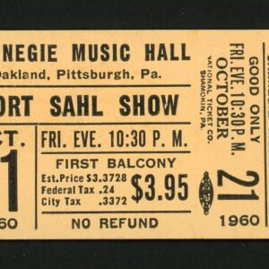 This ticket is from January 16, 1963, from a performance at Memorial Hall in Pittsburgh featuring the folk trio of Peter, Paul and Mary, who went on a massively successful career.  It also notable that this concert occurred on the very day they released the album with “Puff, the Magic Dragon”, which would sell millions of copies and rocket to #2 on the national music charts. Please note the two backwards “s” shaped punches likely indicate this ticket was used for entry that evening.