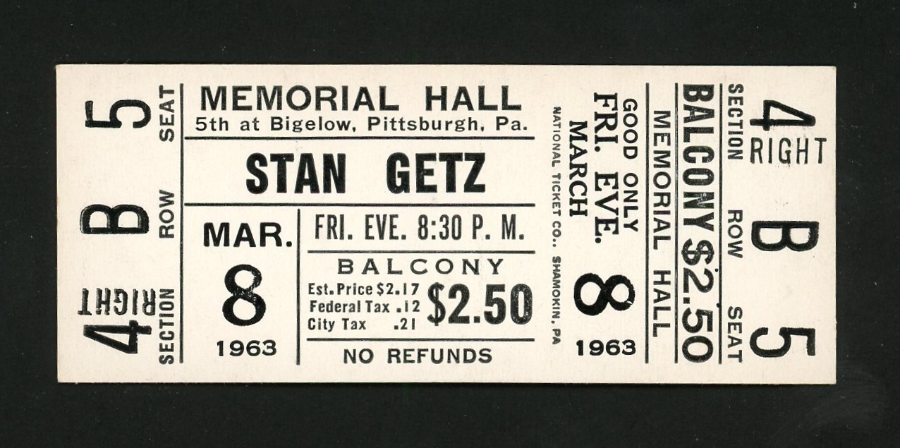This unused ticket is for a performance by jazz great, Stan Getz, March 8, 1963, in Pittsburgh. Getz was primarily a tenor saxophonist, who played a “cool sound” across Big Band, Bebop, and cool jazz compositions. He is recognized as one of the all-time greats.