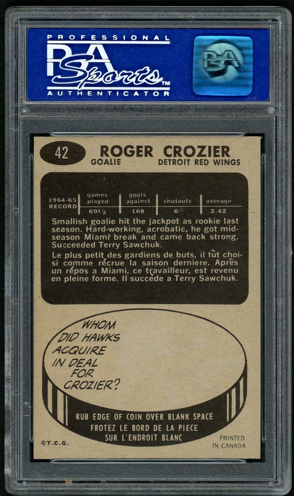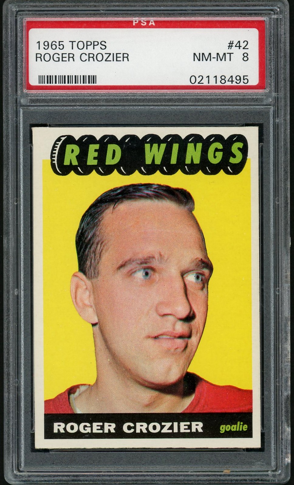 2nd-year card of goaltender Roger Crozier, who broke in with a bang, leading the league with 40 wins and 6 shutouts, winning the Calder Trophy as Rookie of the Year and taking first-team all-star honors. The following year he would backstop the Red Wings to the Stanley Cup finals where they would ultimately lose to the Montreal Canadiens, but Crozier would be named playoff MVP, taking home the Conn Smythe Trophy in a losing cause.