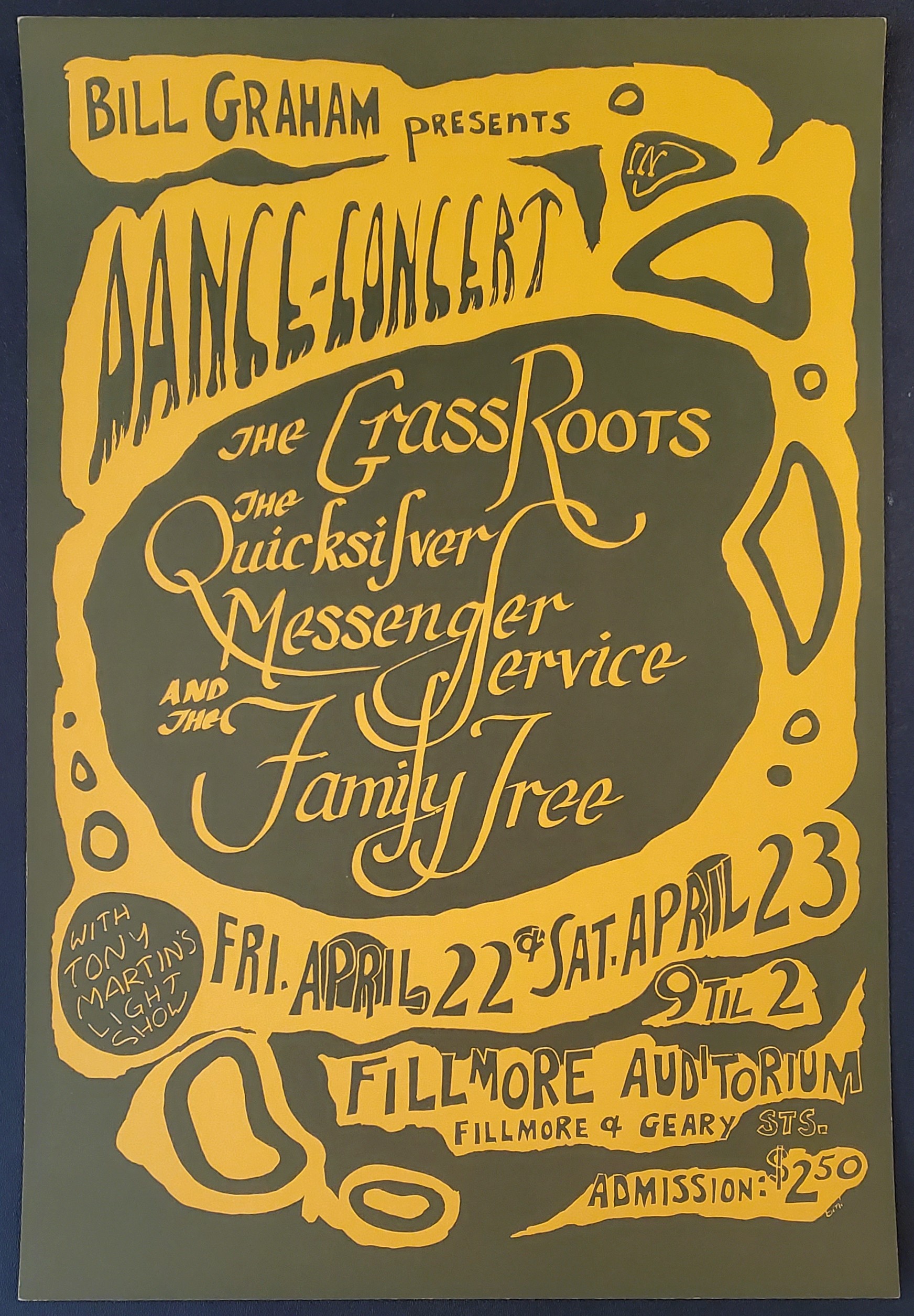 This early 1966 poster promoted a Fillmore show with the Grass Roots, Quicksilver Messenger Service, and the Family Tree.  Among the three acts the Grass Roots would gain some fame outside of San Francisco charting consistently through the early 1970’s.