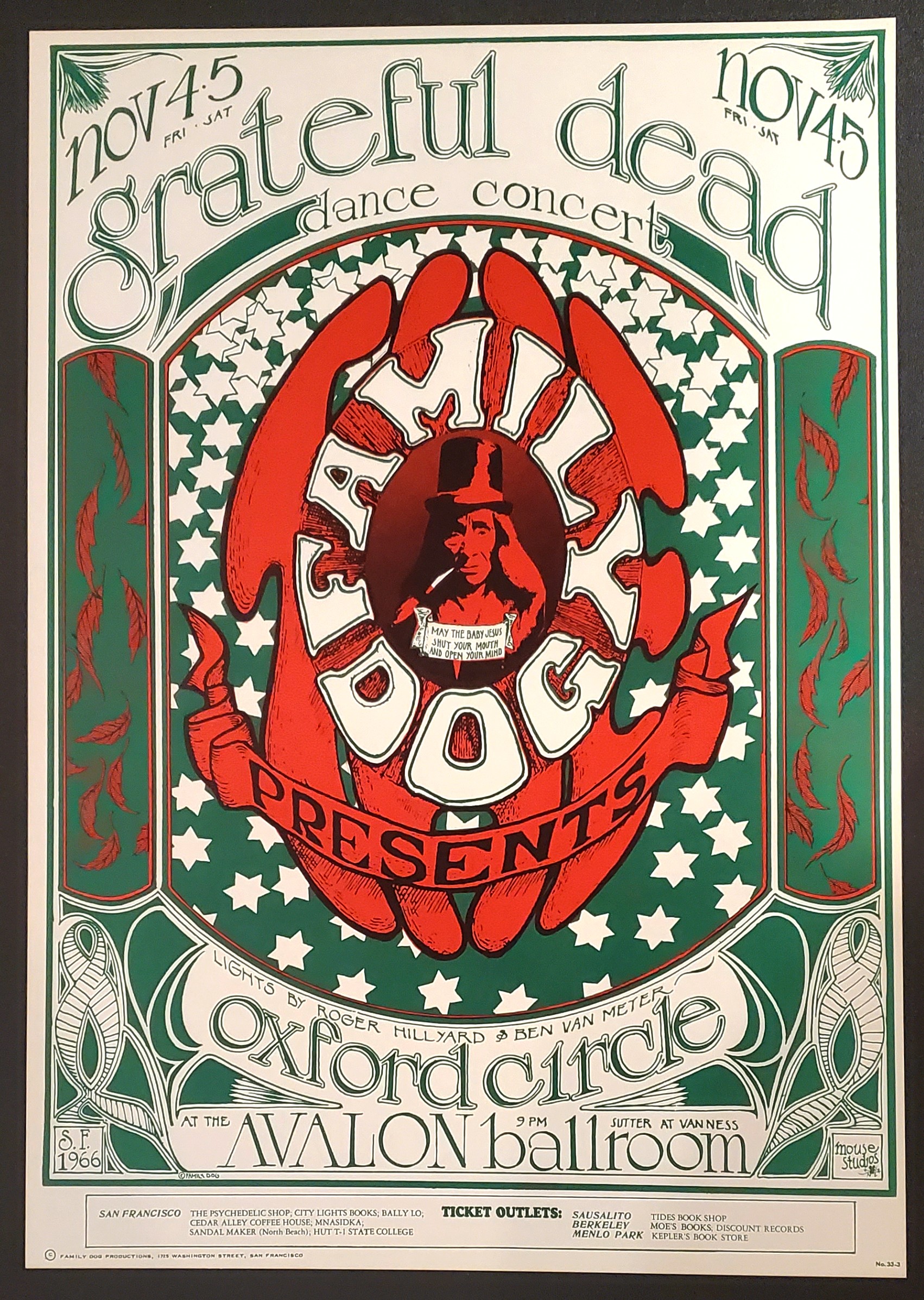 This is one of the Family Dog’s most popular early posters, done by the duo of Mouse & Kelley.  Featuring the Family Dog logo, the poster promotes a pair of shows at the Avalon Ballroom in San Francisco with the Grateful Dead and Oxford Circle.