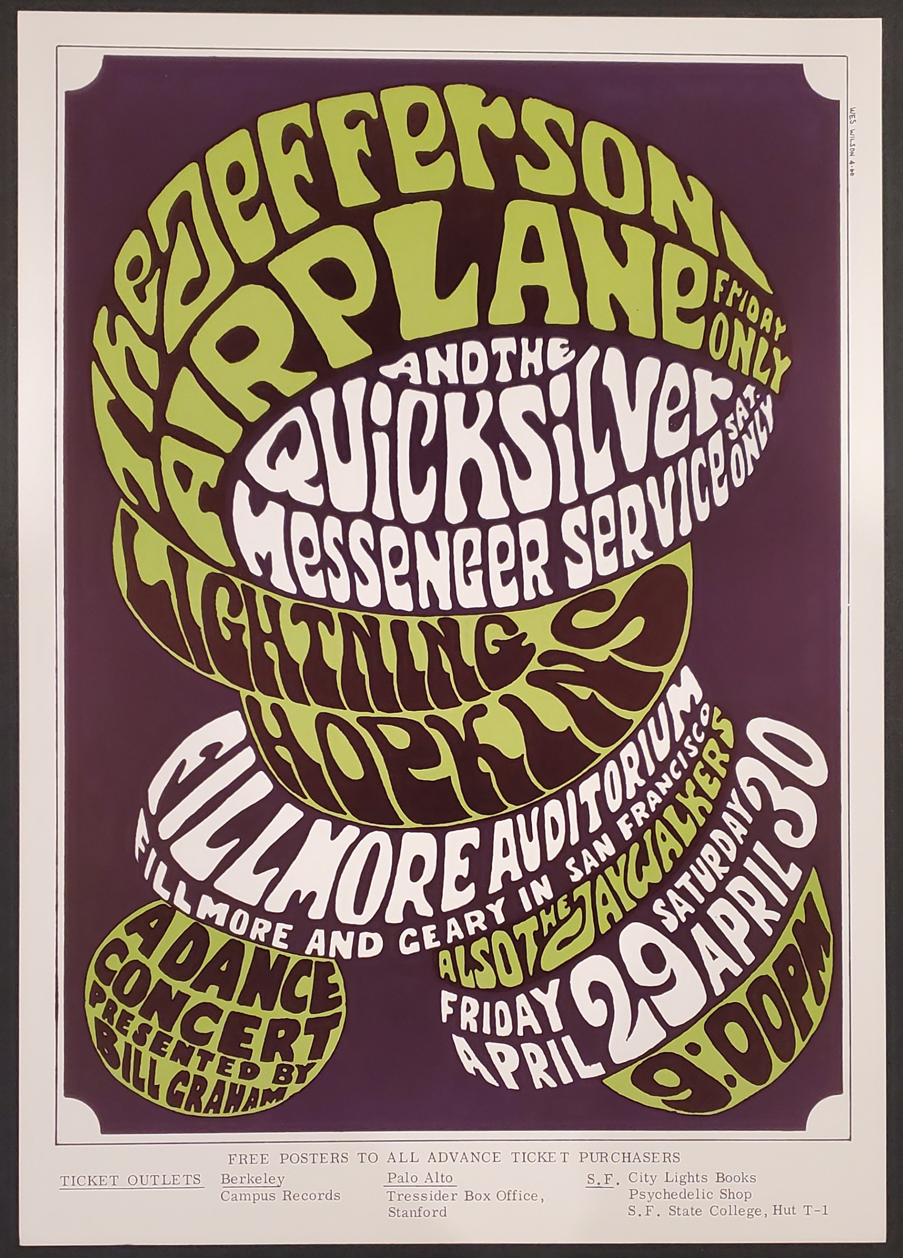 Bands/acts: Jefferson Airplane, Quicksilver Messenger Service, Lightning Hopkins