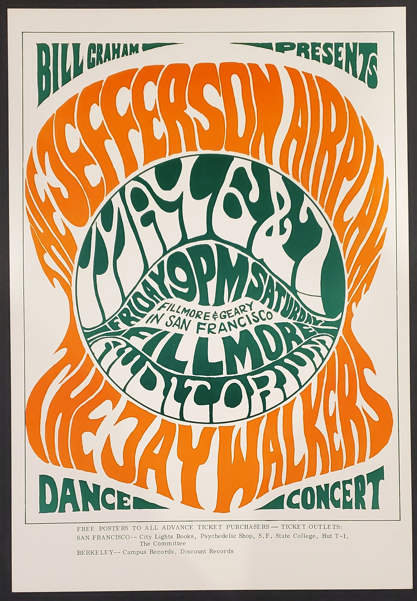 This is a super clean official second printing (of only two printings) of a poster promoting a pair of May 1966 concerts with the Jefferson Airplane and the Jay Walkers at the Fillmore Auditorium, San Francisco, California. The condition is a sharp NM-MT, are by Wes Wilson. This was still early in the Airplane’s timeline, six months before Grace Slick would take over vocal duties from Signe Anderson.