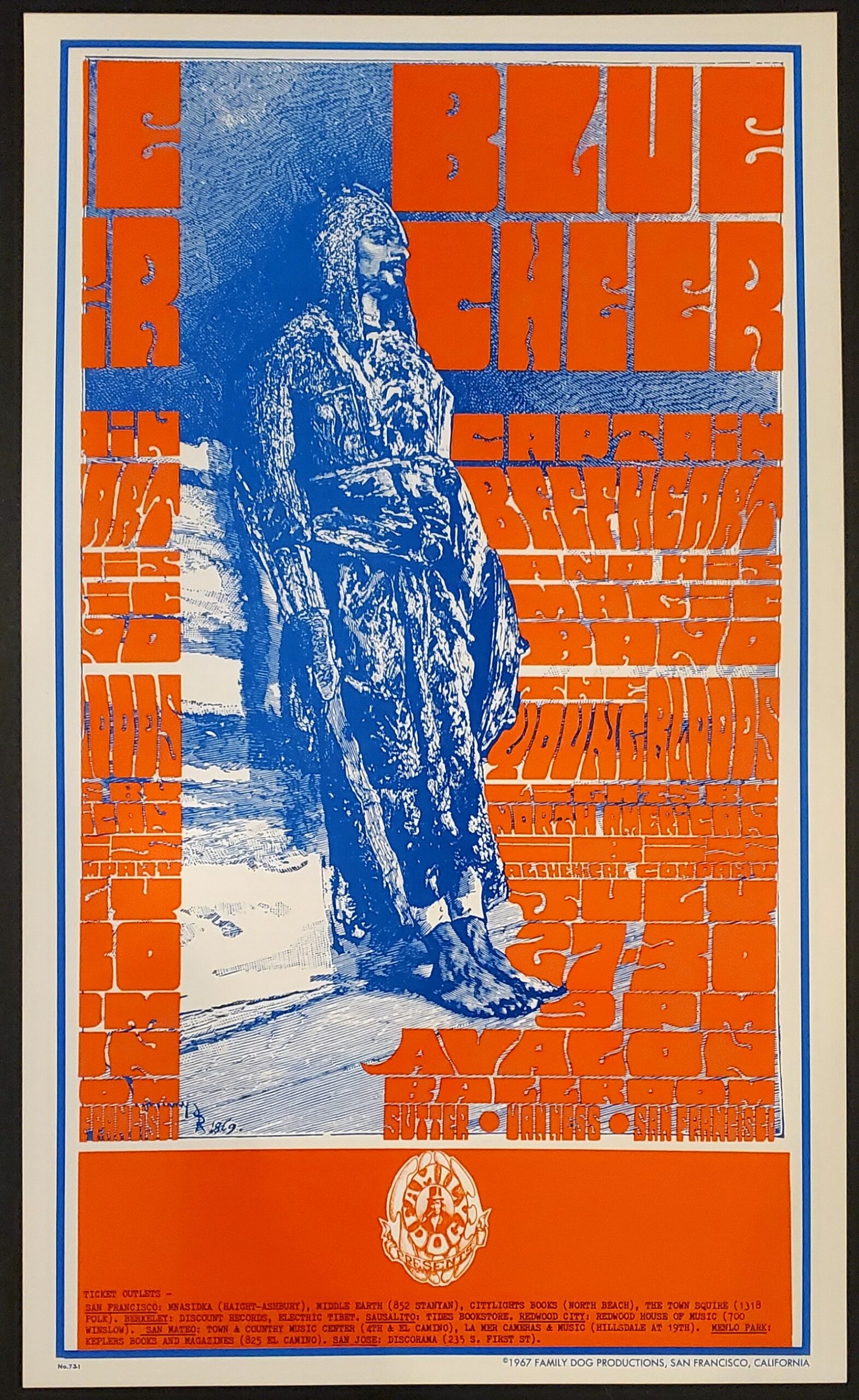 This is an original pre-concert poster from July 1967 promoting a series of shows by hard rockers Blue Cheer, the eclectic Captain Beefheart and his Magic Band, and the Youngbloods at the Avalon Ballroom, San Francisco, California.