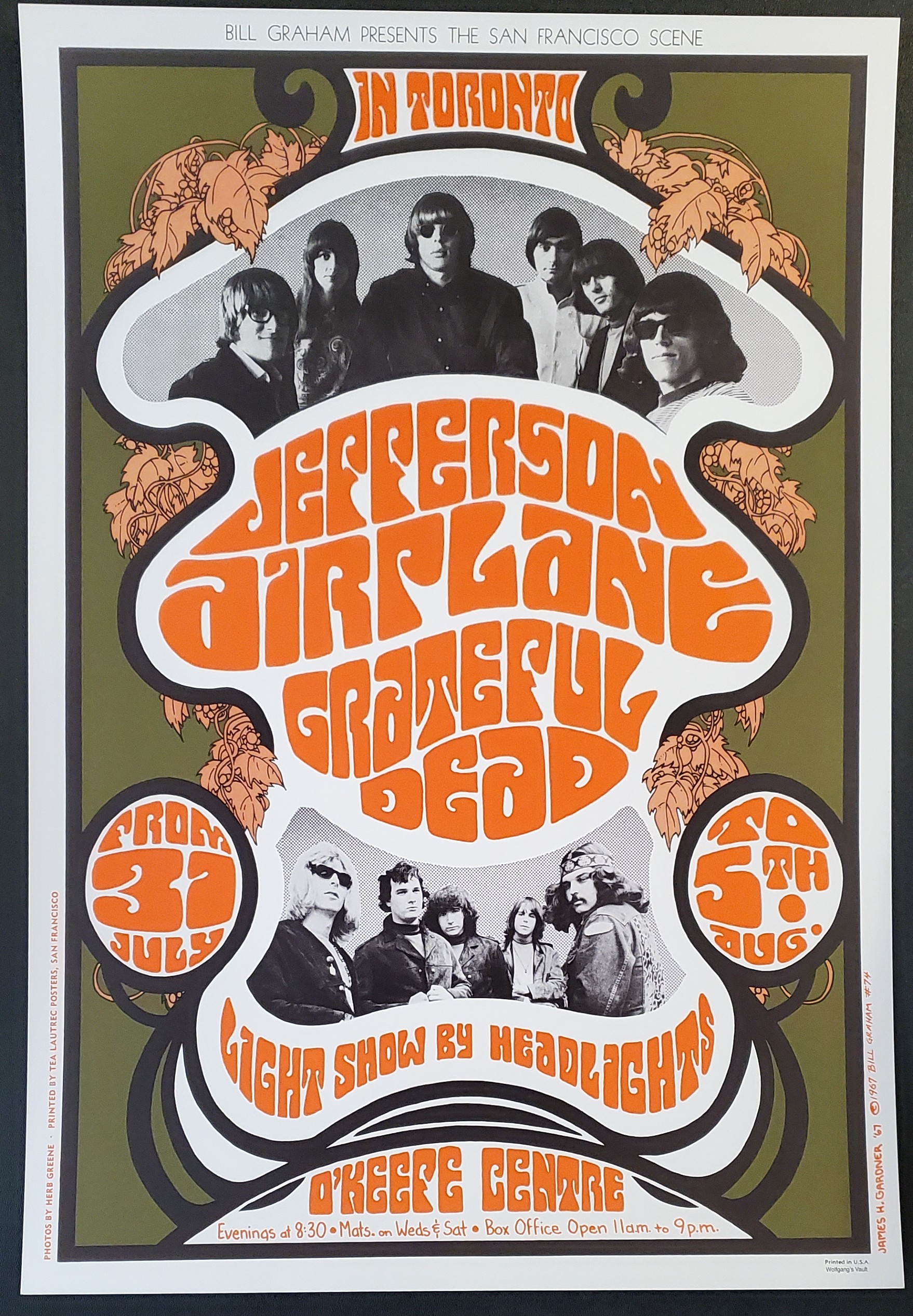 This is an authorized second printing of a very rare poster from July 1967 done to promote a series of shows by the Jefferson Airplane and Grateful Dead in Toronto, Canada.  In 1967 Graham took some SF bands on the road to deliver the “San Francisco” scene, including the Hollywood Bowl in Los Angeles, and this run at the O’Keefe Centre.