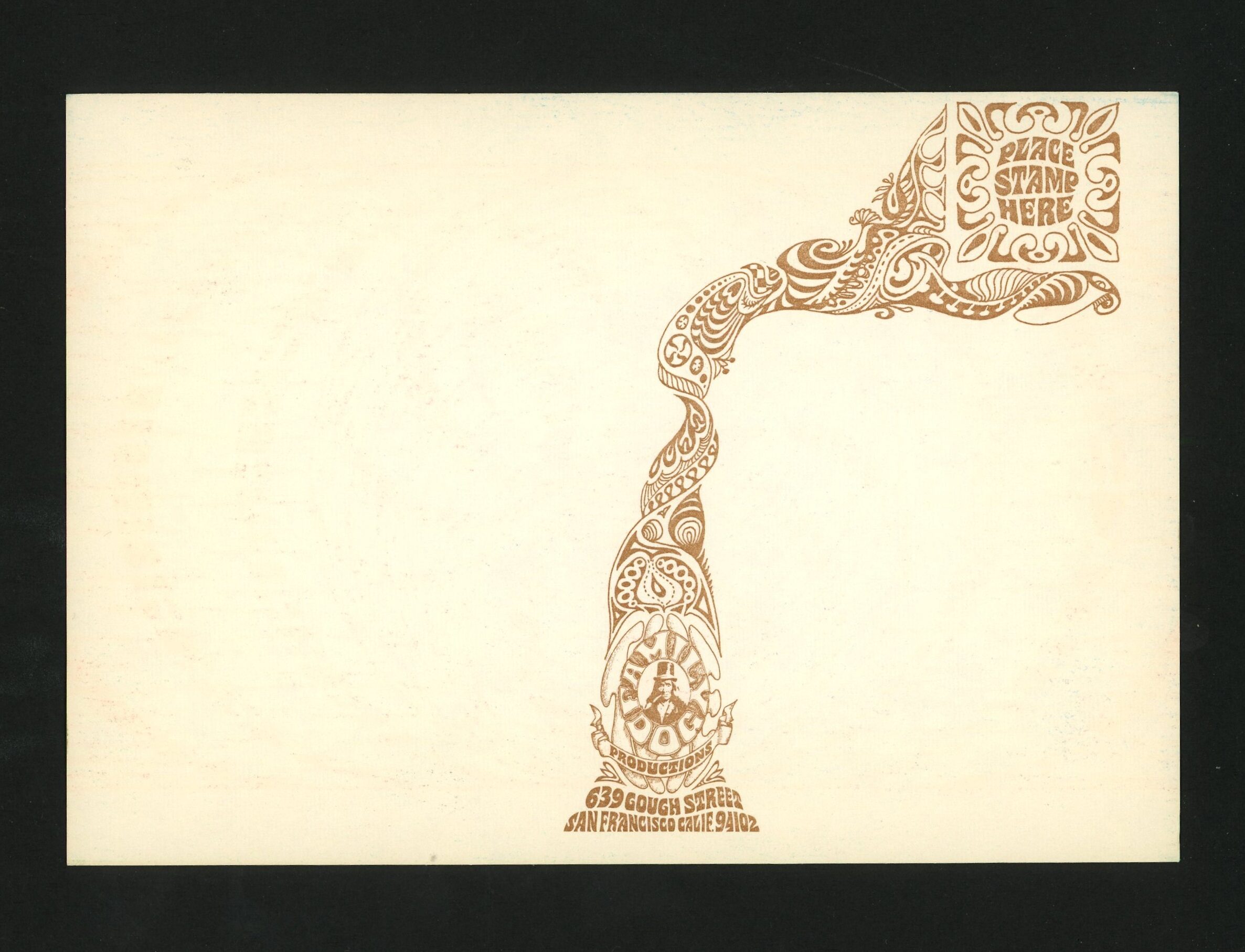Straight from the “Summer of Love”, this heavily psychedelic poster/card is the work of Victor Moscoso. The June 1967 shows at the Avalon Ballroom feature Bay Area regulars Quicksilver Messenger Service and Big Brother & The Holding Company, who of course feature lead singer, Janis Joplin. Also on the bill were Mount Rushmore and Blue Cheer. There was only one pre-concert printing, known as FD-68 in the Family Dog series.
