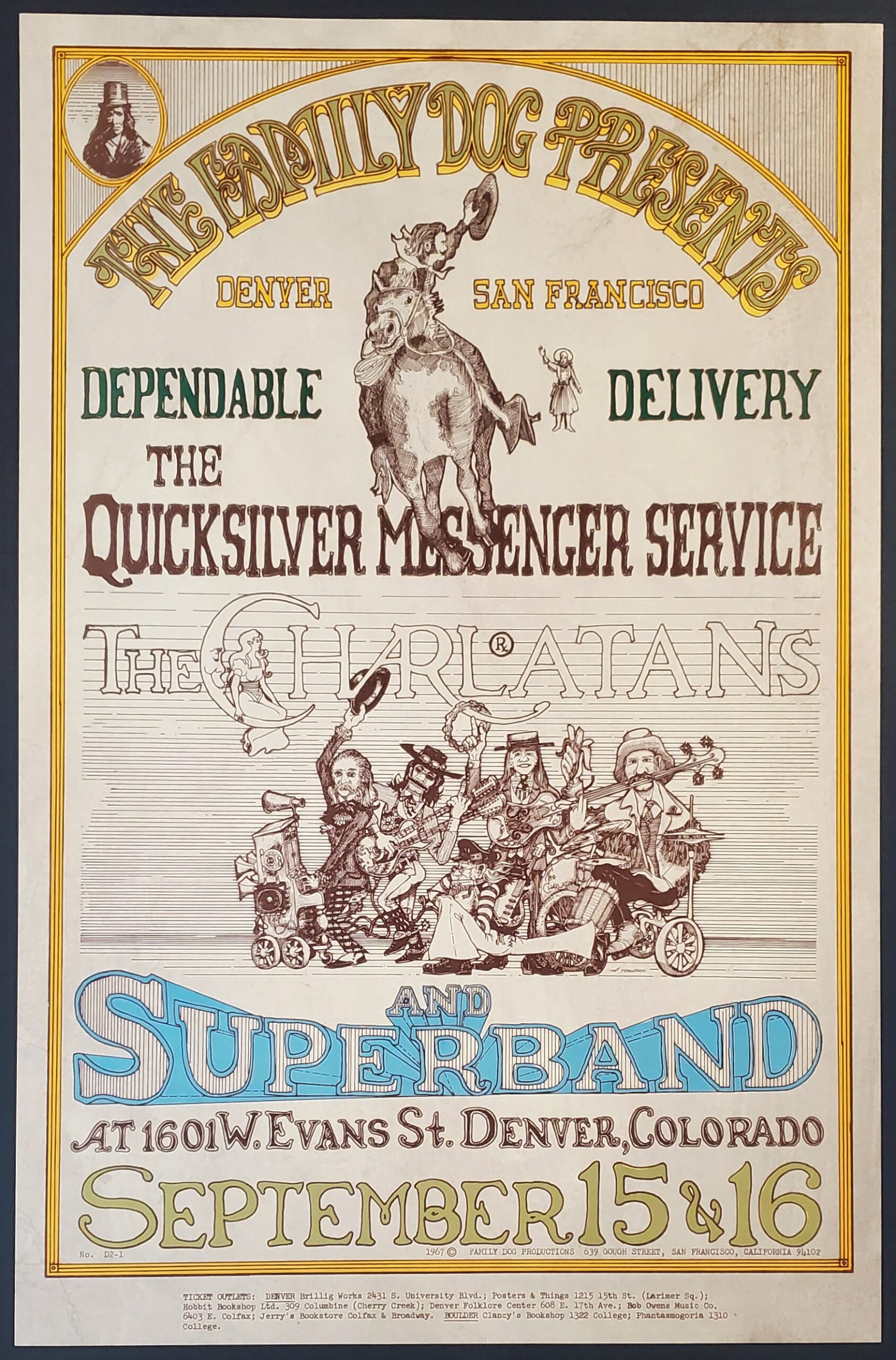 This is an original printing (pre-concert) poster from a pair of September 1967 performances by Quicksilver Messenger Service, the Charlatans, and Superband, at the Family Dog, Denver, Colorado.