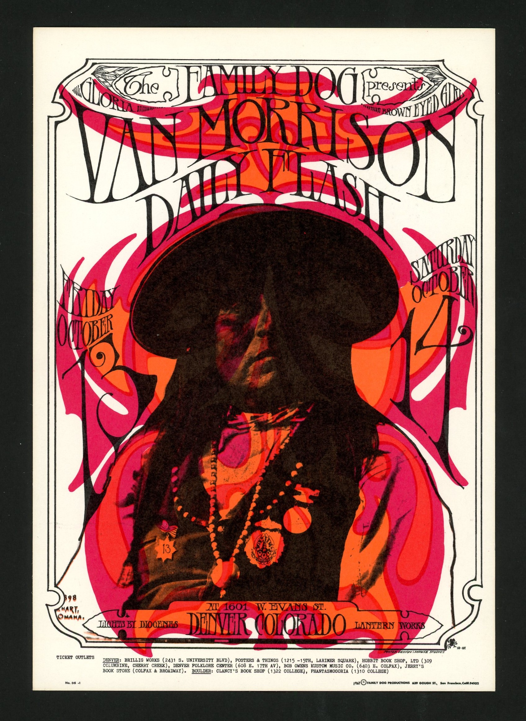 This brilliant design is by the power duo of Alton Kelley and Stanley Mouse it promotes a pair of upcoming Family Dog concerts in Denver, Colorado, featuring ex-Them vocalist, Van Morrison, and Daily Flash. Printed only once, prior to the concert, this is catalogued as FDD-6 in the Family Dog series.