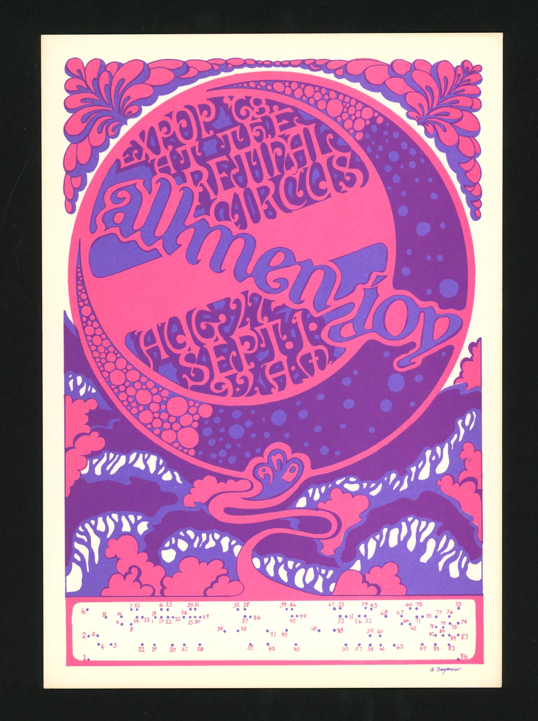 This blank-backed postcard promotes a series of late August/early September shows featuring Allmen Joy, a San Francisco psychedelic band, and apparently a “surprise” guest. Art by Steve Seymour, this is the 30th card in the RC series.