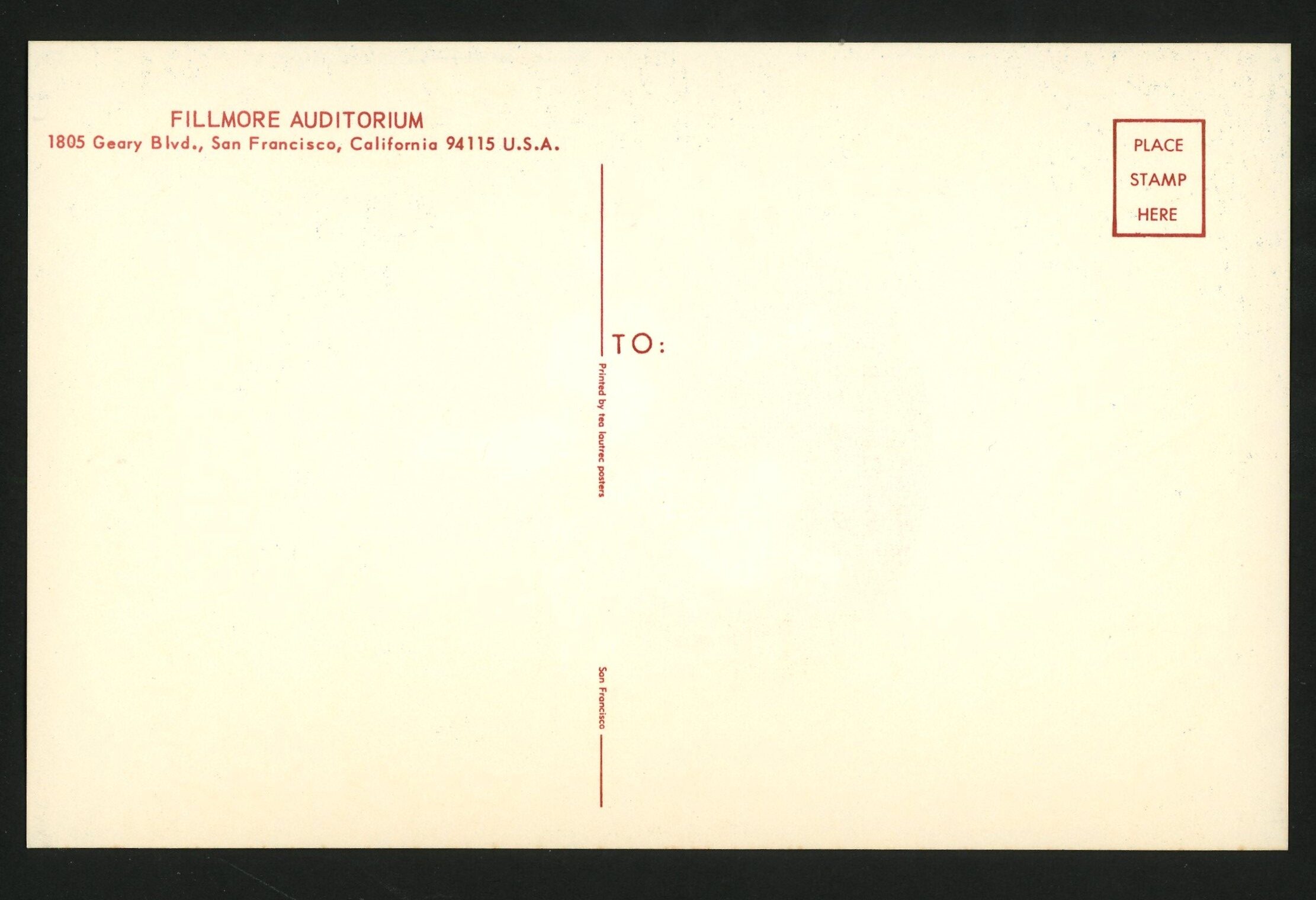 Superb trio of acts here, with Big Brother and the Holding Company (with lead singer, Janis Joplin), Iron Butterfly and Booker T. and the MG’s. Art on this wildly psychedelic piece is by Patrick Lofthouse and Tom Weir. This card was printed only once, prior to the concert and is known as BG-115 in the Fillmore Series.