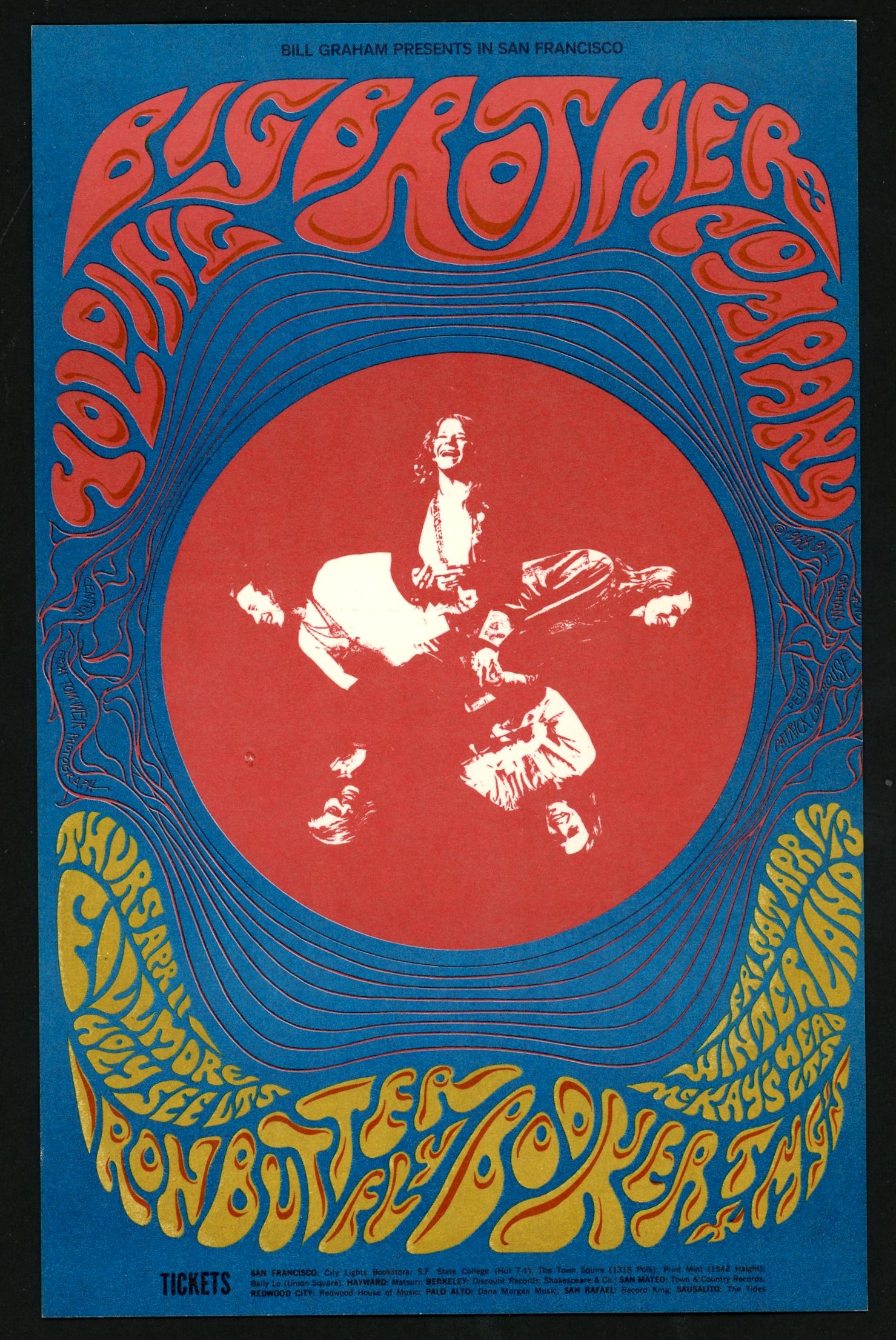 Superb trio of acts here, with Big Brother and the Holding Company (with lead singer, Janis Joplin), Iron Butterfly and Booker T. and the MG’s. Art on this wildly psychedelic piece is by Patrick Lofthouse and Tom Weir. This card was printed only once, prior to the concert and is known as BG-115 in the Fillmore Series.