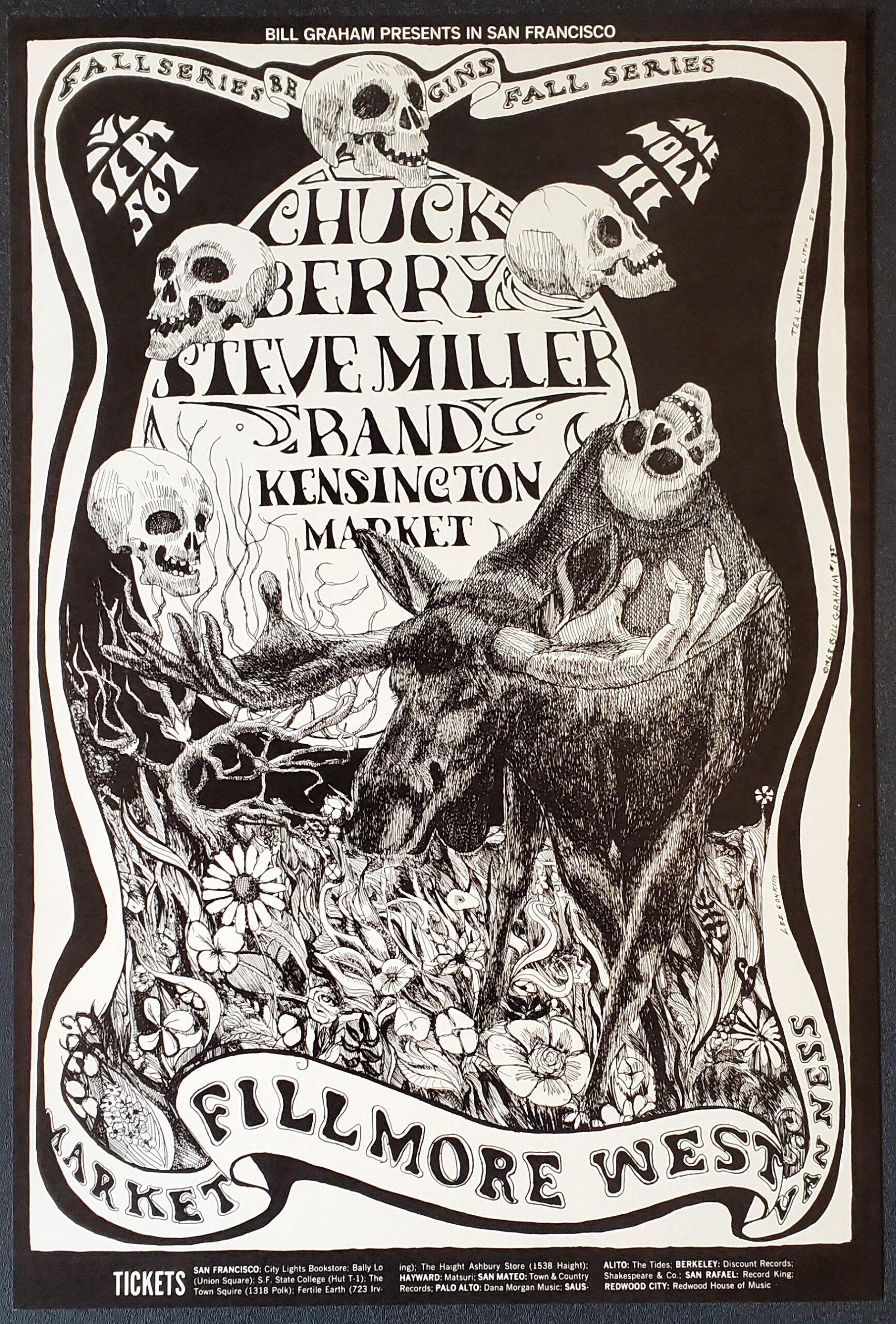 Amazing design by artist Lee Conklin for September 1968 shows at the Fillmore West. Headlining was rock and roll legend, Chuck Berry, along with the Steve Miller Band and Kensington Market. Superb original, pre-concert printing.