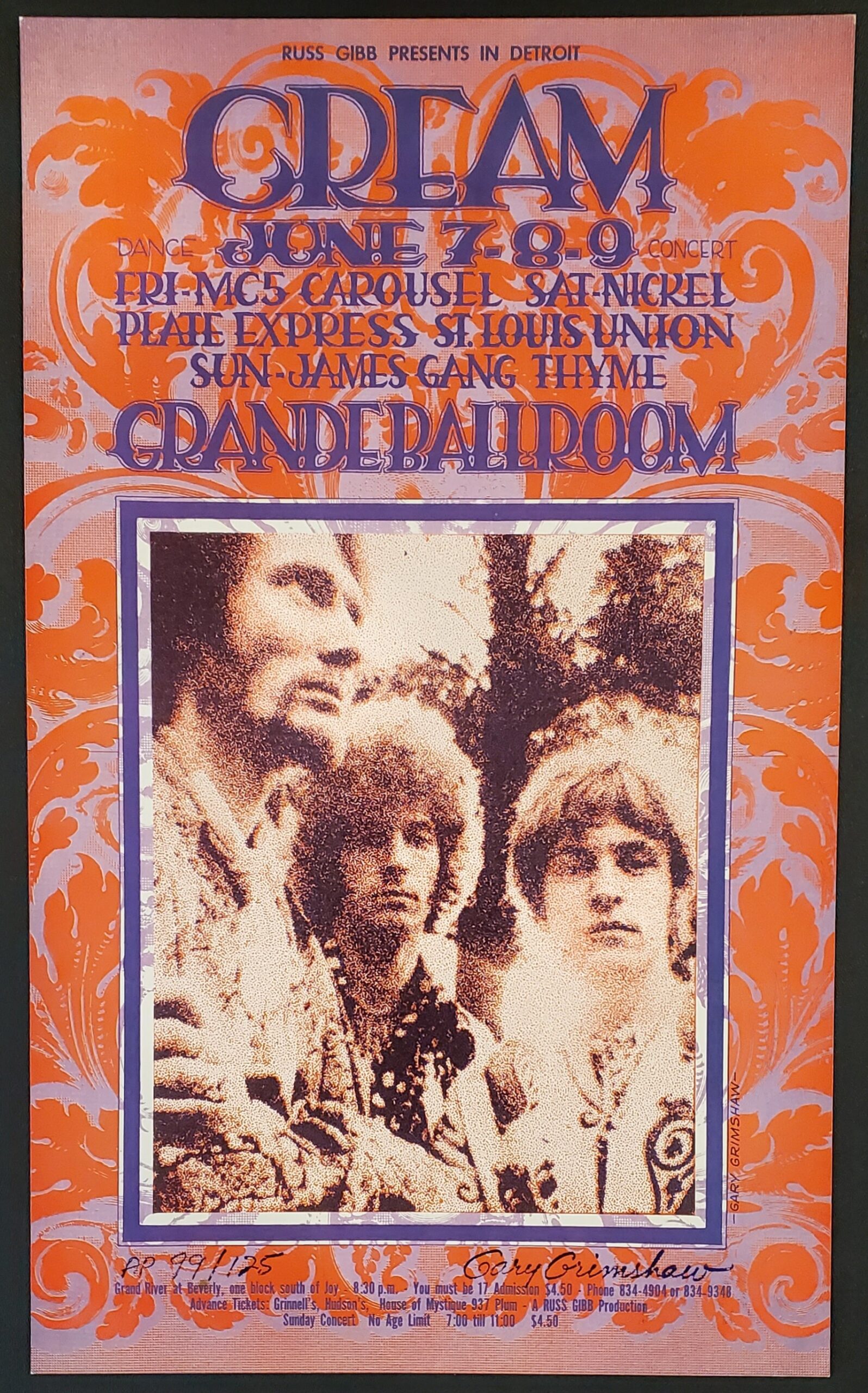 Very cool, authorized second printing “artist’s proof”, signed and numbered by artist Gary Grimshaw. This is #99 of only 125 signed AP’s. Grimshaw was the driving force behind the Detroit concert poster scene, in particular the shows held at the Grande Ballroom. Original Grande posters carry some high price tags, thanks to small print runs, legendary acts, and great artwork. This printing, and signed AP, represents a great opportunity to experience this iconic poster without having to shell out thousands of dollars.