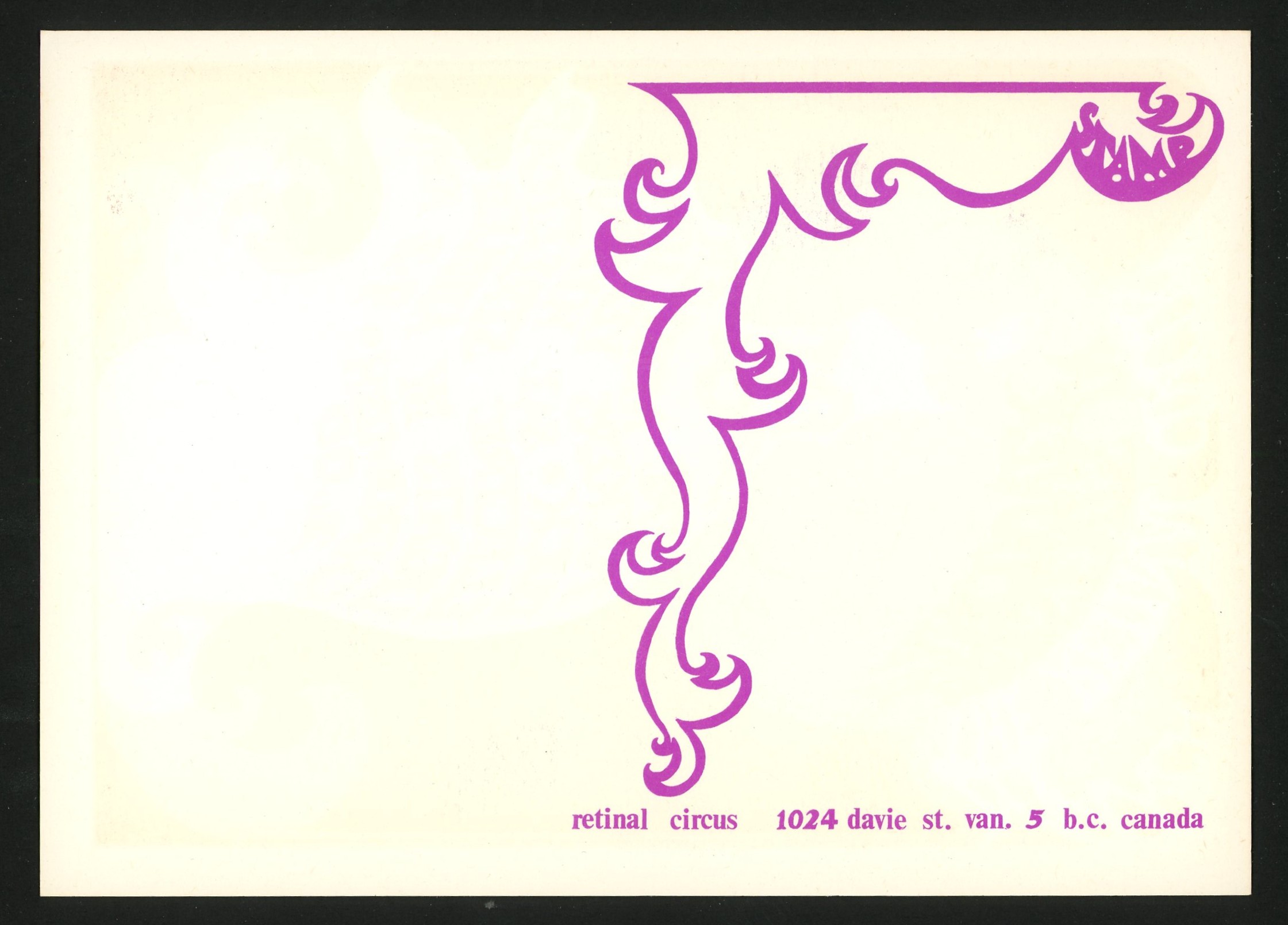 This card was issued to promote a pair of Retinal Circus shows in March of 1968 with Seattle-based Fat Jack, with Mother Tucker’s Yellow Duck and Hydro Electric Streetcar. Art by Steve Sinclair, this is card #6 in the RC series.