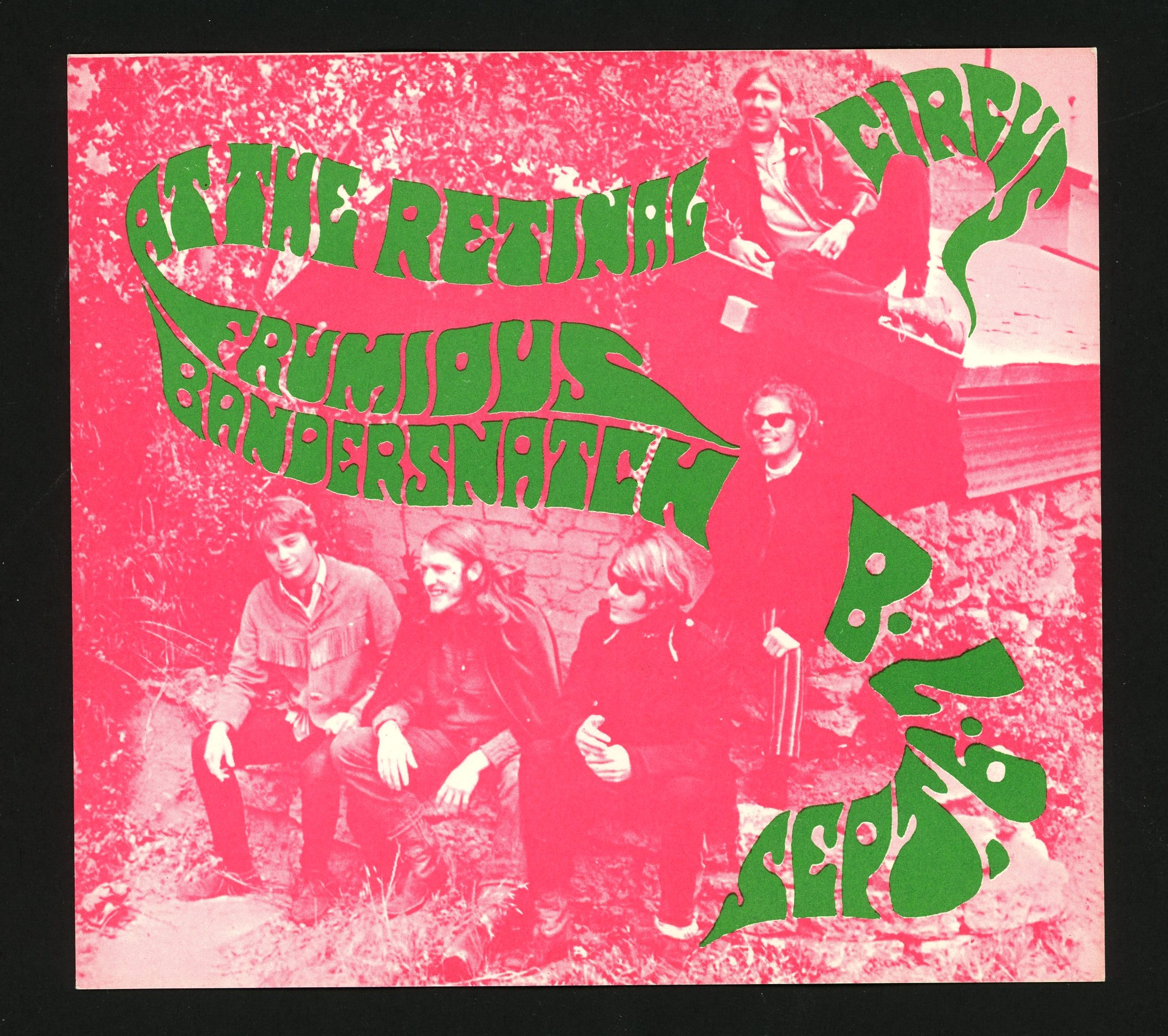 Frumious Bandersnatch, one of the more interestingly named bands, was a Berkeley-based psychedelic rock band active from 1967 to 1969. It was named after a character from the Lewis Carroll poem “Jabberwocky”. This scarce blank-backed handbill measures 6″ x 6 1/2″ and was issued to promote a series of upcoming shows at the Retinal Circus in Vancouver, Canada. One example recently sold at auction for $325 USD.
