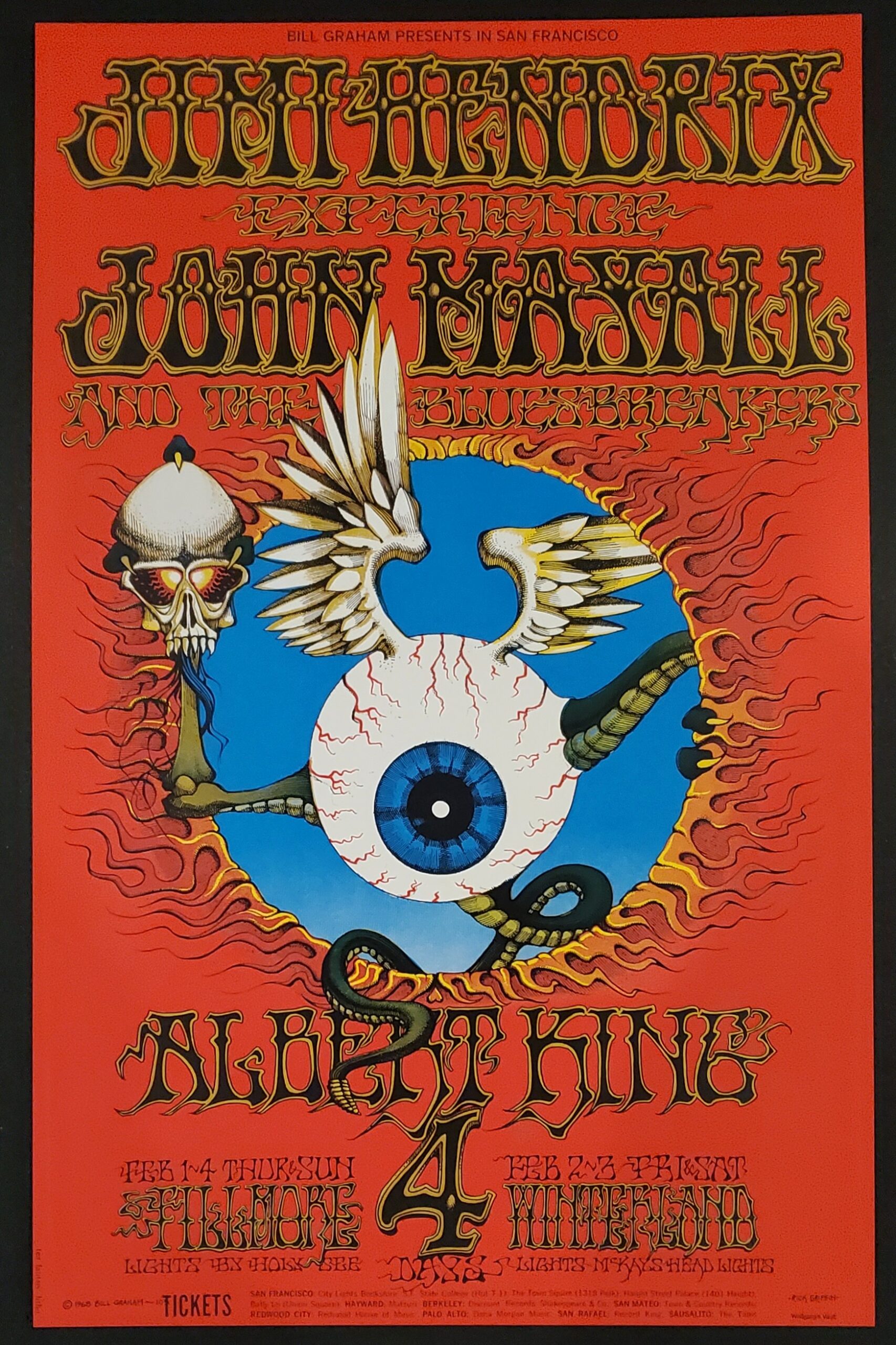 One of the most recognizable rock posters of all-time combines the incredible work of artist Rick Griffin with one of the era’s most iconic acts, Jimi Hendrix. These shows took place over four days in early 1968 at the Fillmore and Winterland venues in San Francisco, California. Supporting acts included British blues great John Mayall and American blues master, Albert King. Griffin was paying homage here to the Hot Rod artist Von Dutch, who penned the original “Flying Eyeball”.