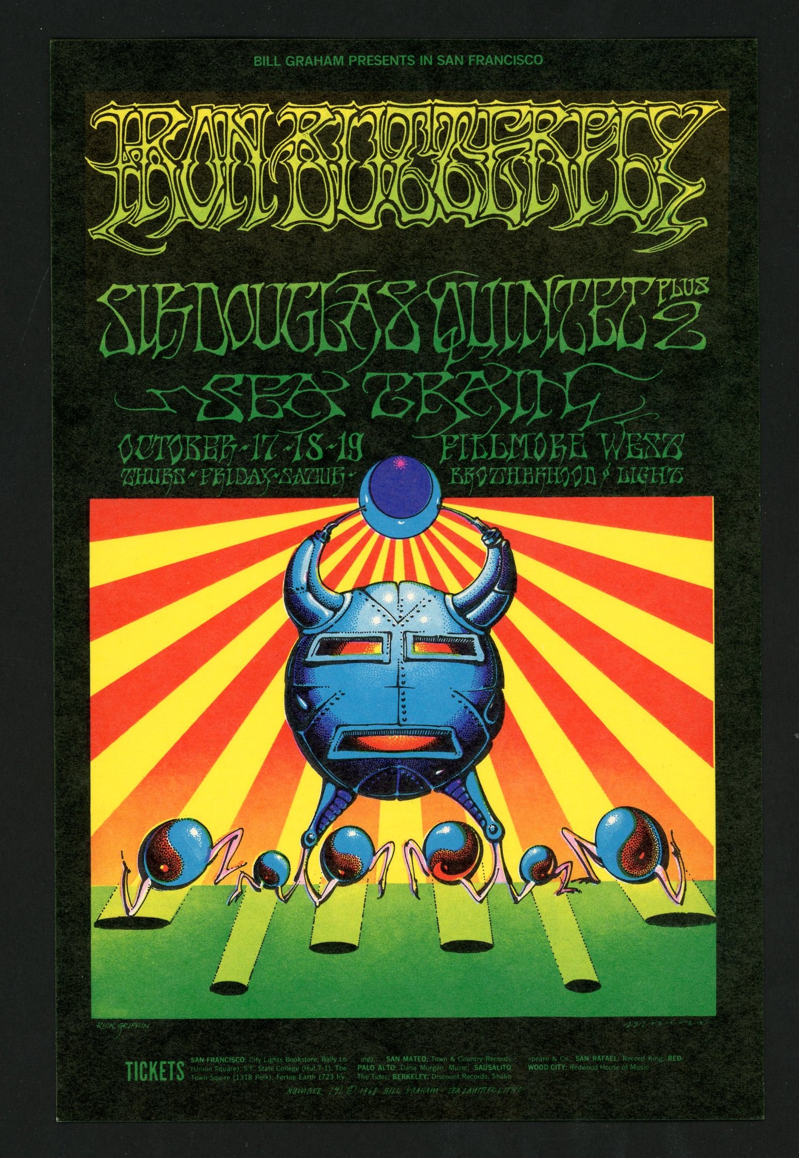 One of artist Rick Griffin’s most famous pieces, this one is a collaboration with fellow SF artist, Victor Moscoso. The poster was designed to promote a series of shows at the Fillmore West with LA rockers Iron Butterfly headlining, with the Sir Douglas Quintet and Sea Train.  This is known as BG-141 and is a pre-concert printing.
