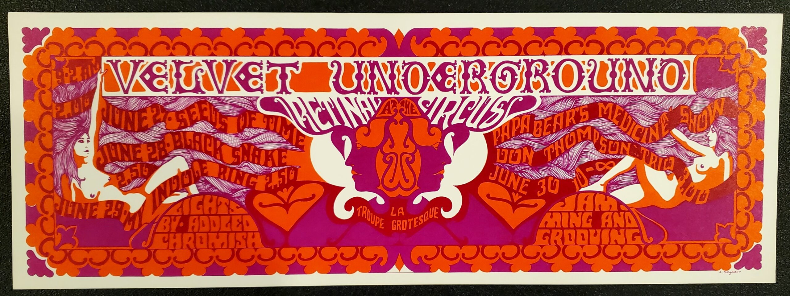 The premier piece in the Retinal Circus postcard series is this Steve Seymour oversized (5″ x 14″) effort promoting a series of shows by the Velvet Underground, June 1968. Although not a commercial success, the Velvets nevertheless were one of the most influential bands of the era. This was several months after the release of the band’s second album, and several months prior to John Cale’s departure. The opening acts for the run of shows included Black Snake Blues Band, My Indole Ring, Papa Bear’s Medicine Show, and the Don Thompson Trio. Recently one of these sold at auction for $360 USD.
