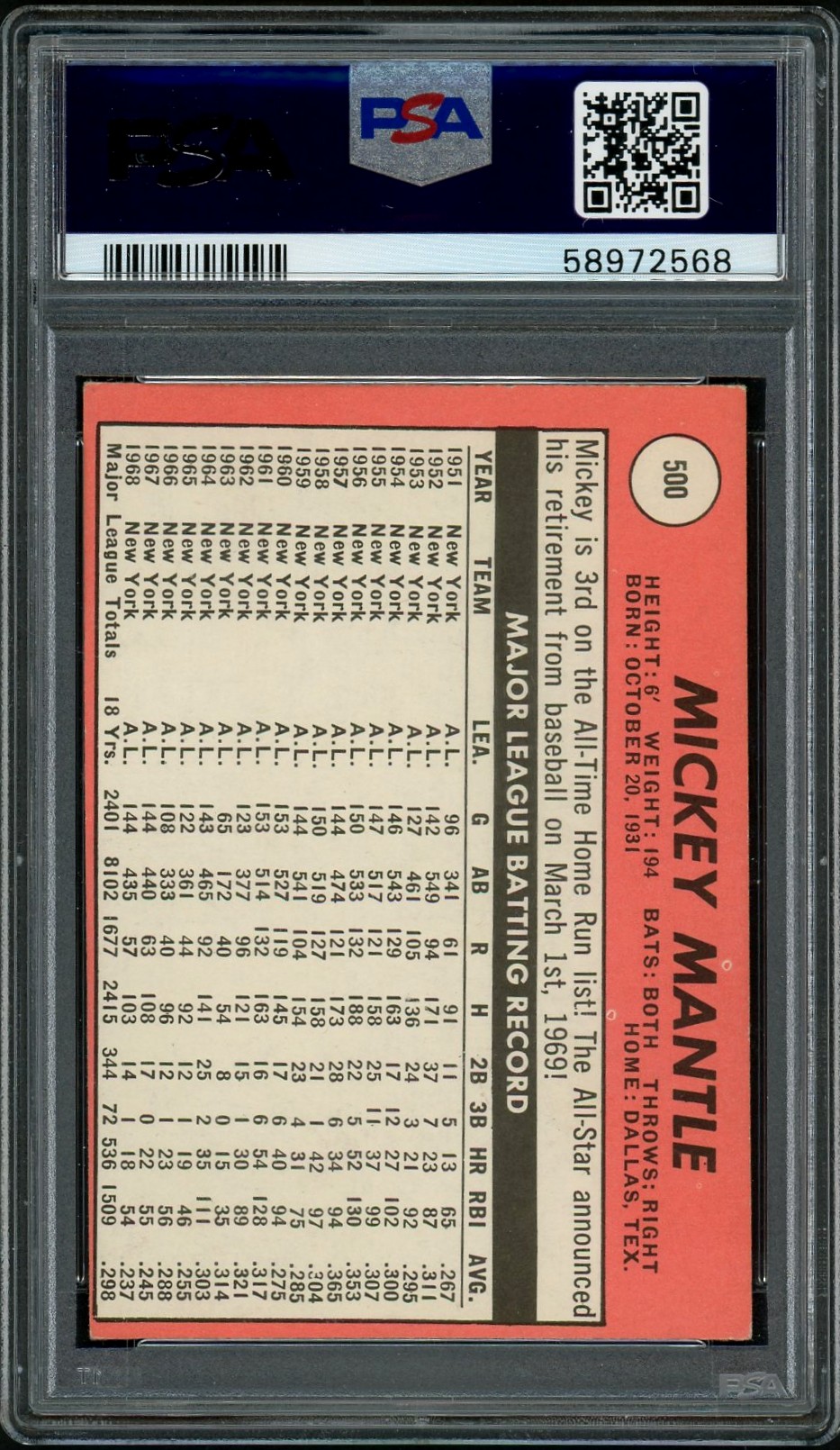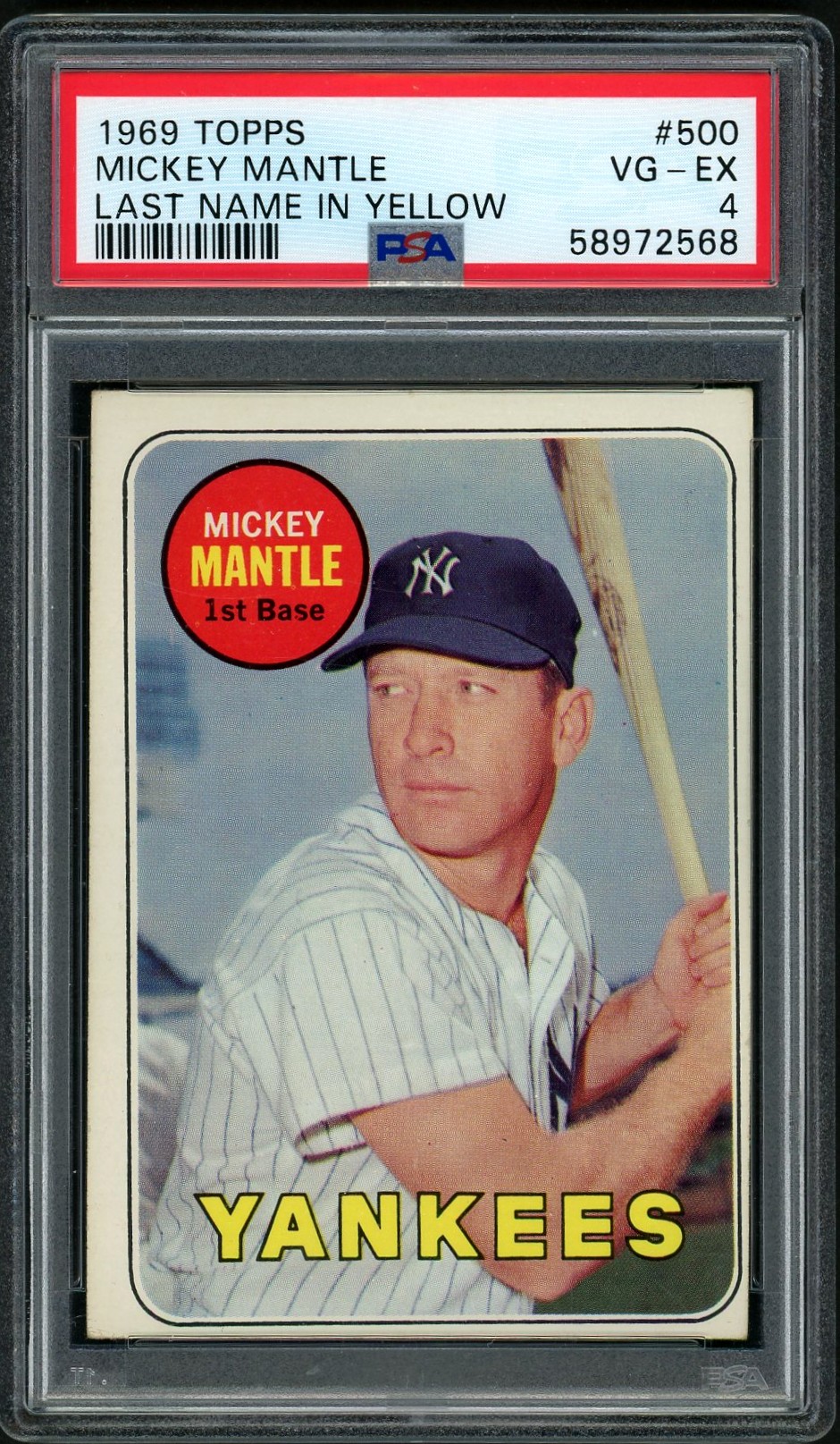 The legend at the end of his HOF career, this is the “last name in yellow” version. Mantle continues to bring strong prices across the hobby. Crease free and clean!
