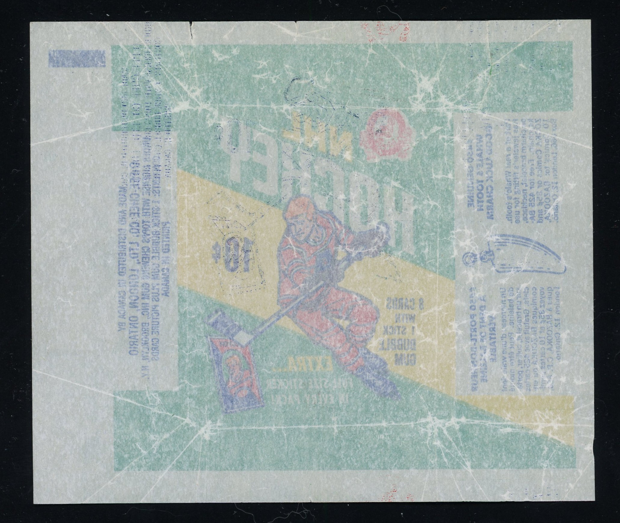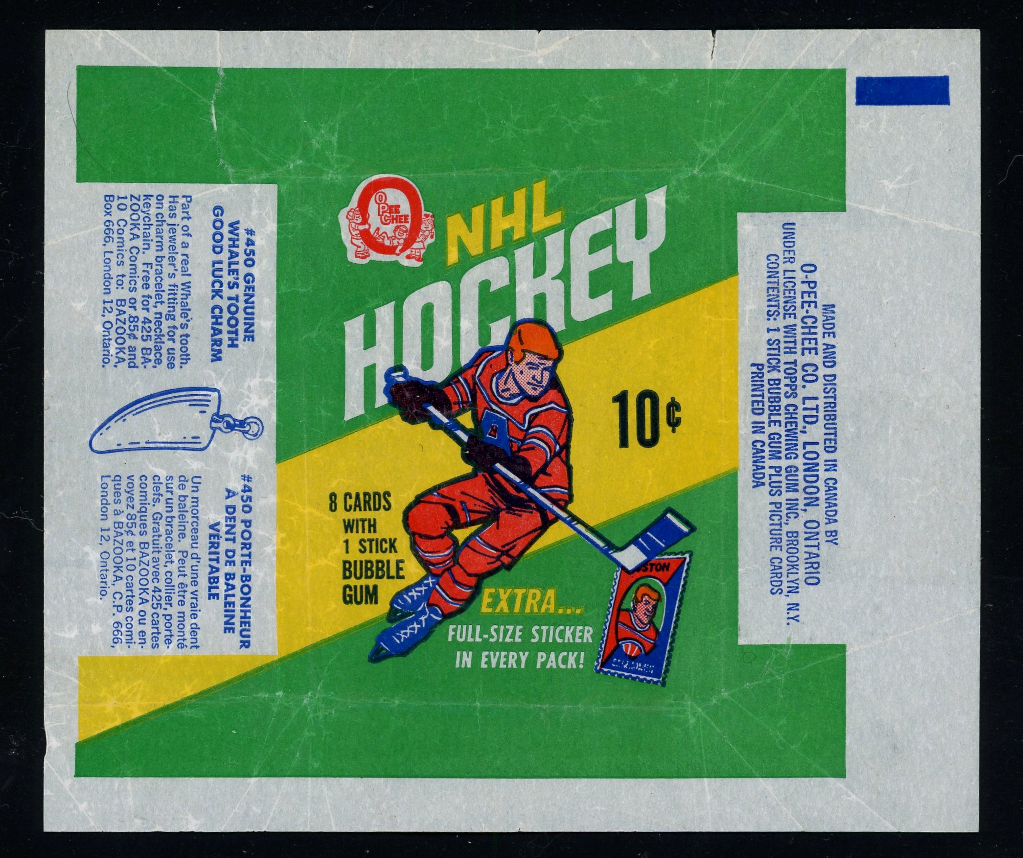 Elusive 10-cent, series one, wax wrapper from the popular 1970-71 OPC hockey set.  Very nice condition, has some light tears across the top border (one approximately 1/2 inch in length), see scans.