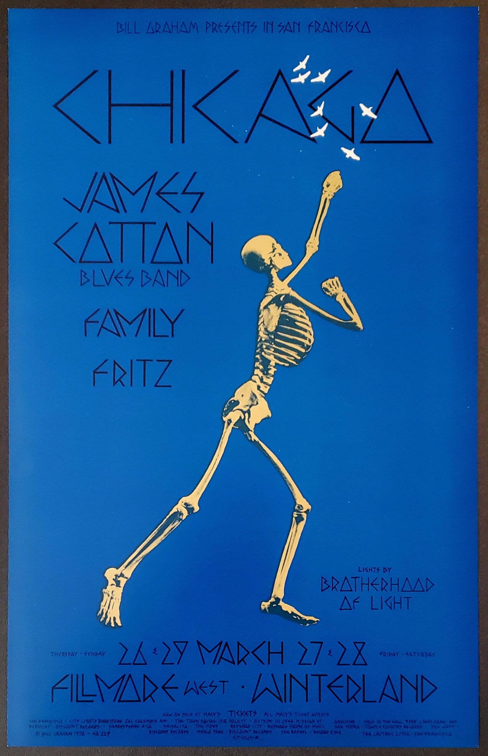 One of artist David Singer’s most memorable and popular posters! This one promotes a series of shows in March of 1970 held between the Fillmore West and Winterland venues in San Francisco and featuring Chicago, the James Cotton Blues Band, Family and Fritz.