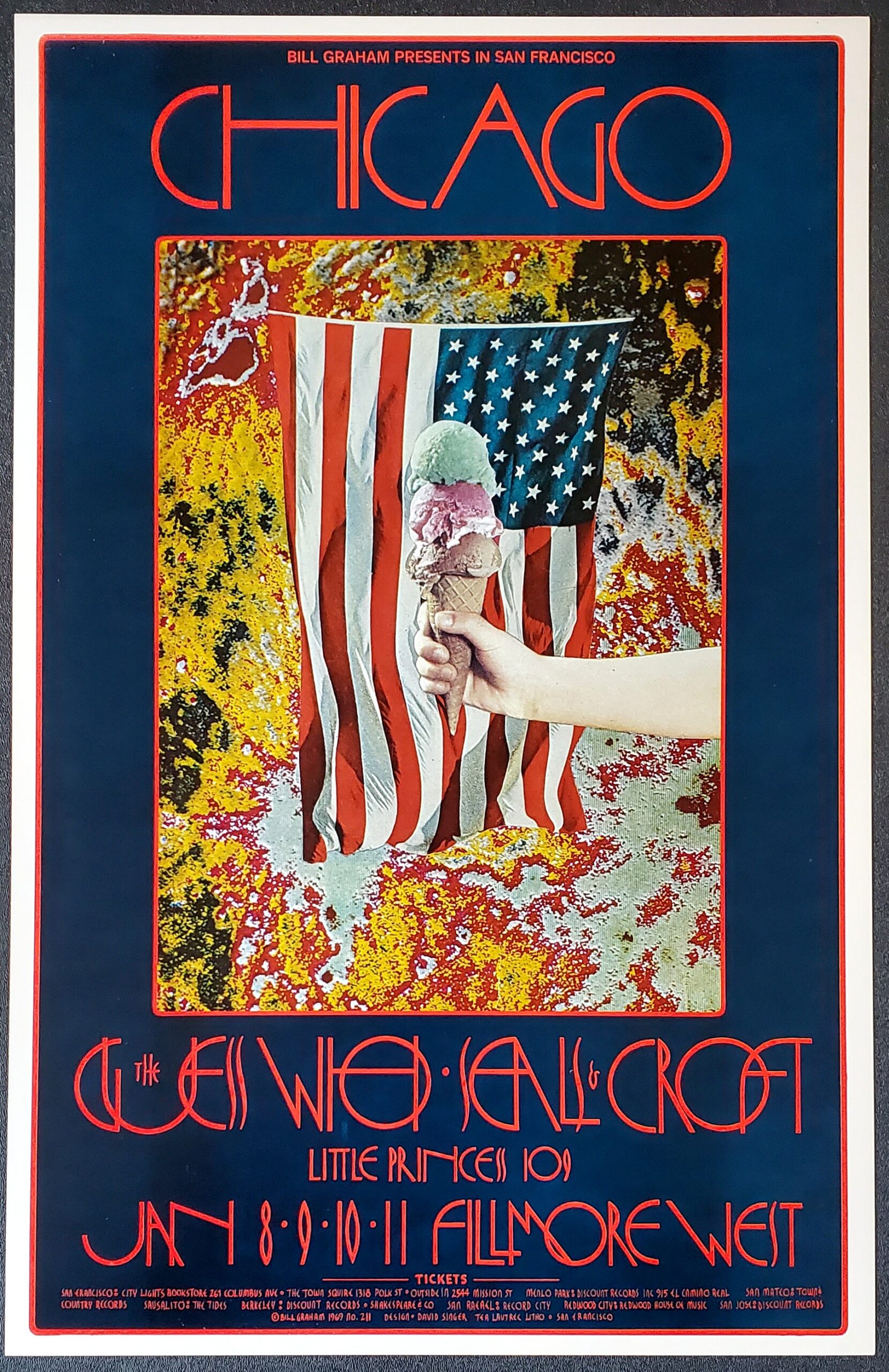 Amazing poster by David Singer, featuring his extravagant lettering around his signature collage style centerpiece. This pre-concert poster promotes shows featuring Chicago, who had recently shortened their name from “Chicago Transit Authority” and were transitioning their sound to a more radio-friendly, commercially oriented sound. Supporting acts were the Guess Who and Seals & Croft. In all, there are 40 top-10 singles on this bill.