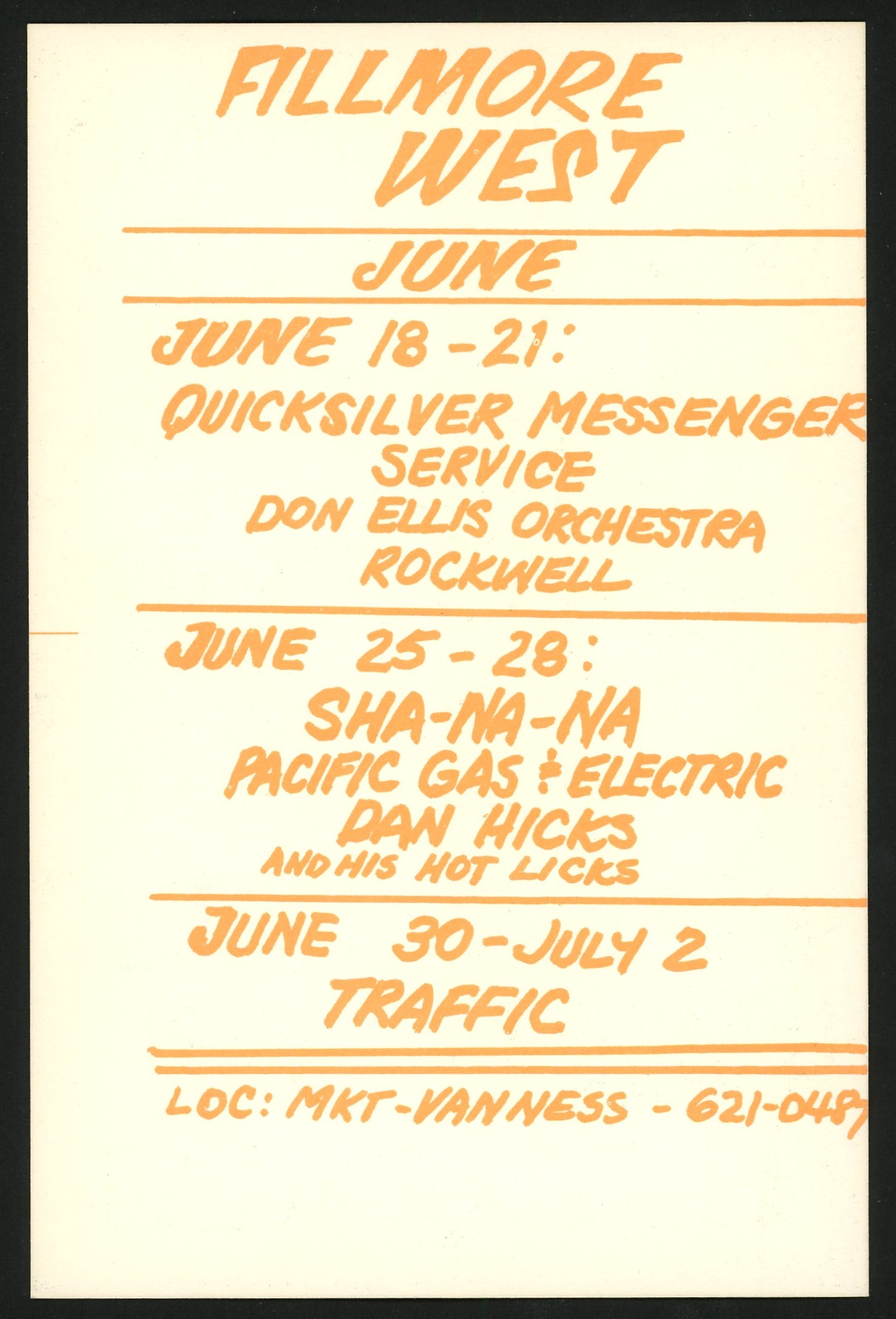 This is an original pre-concert postcard for a run of summer concerts at the Fillmore West in San Francisco.  June 24-28 included Sha Na Na, Pacific Gas & Electric, and Dan Hicks & His Hot Licks.  June 30 to July 2 featured Stevie Winwood and Traffic, along with Leon Russell.  The back the postcard (more in tune with a handbill) is a calendar of events at the Fillmore, including Quicksilver Messenger Service.  Art is by David Singer, and it is known as BG-240 in the Bill Graham series.