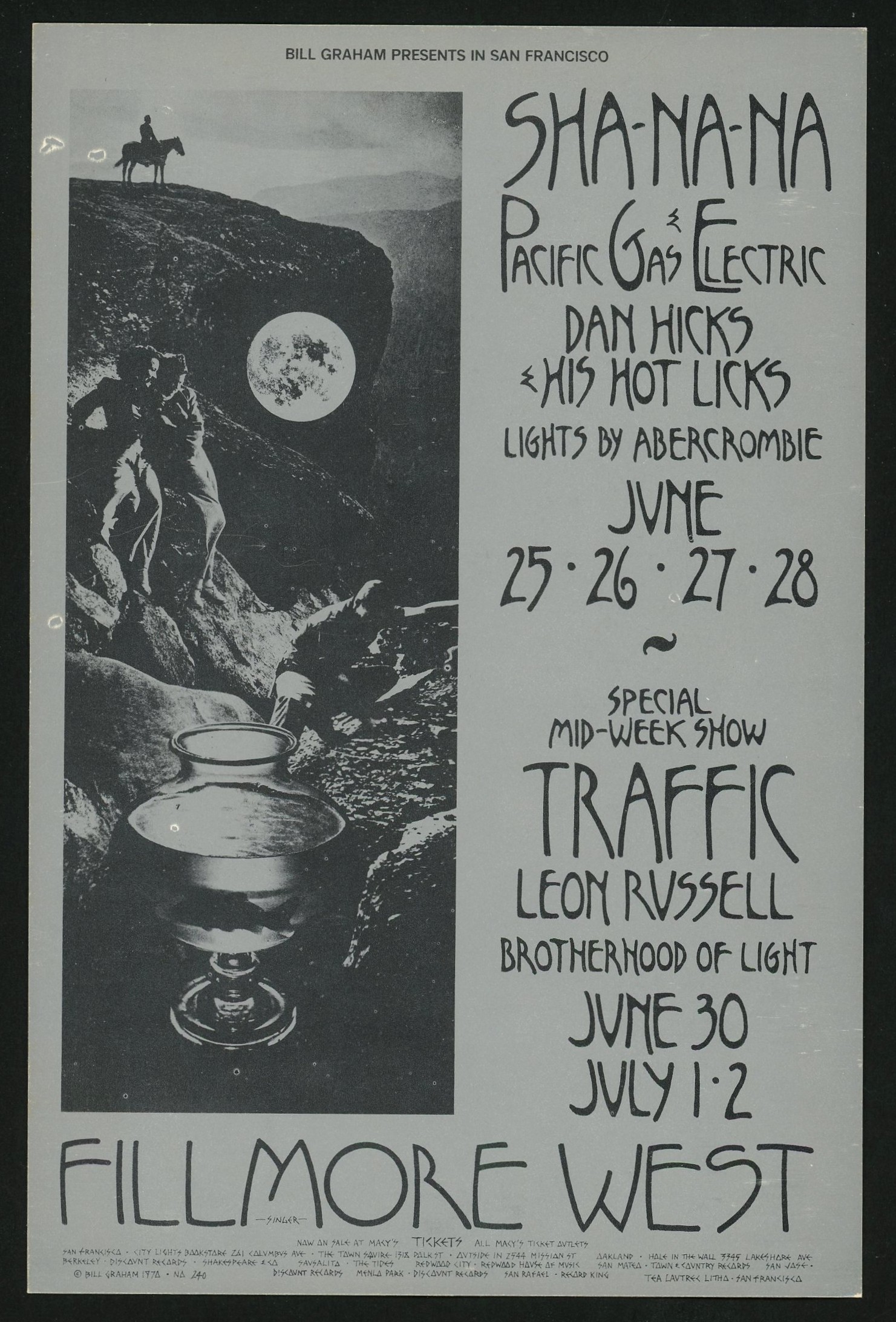 This is an original pre-concert postcard for a run of summer concerts at the Fillmore West in San Francisco.  June 24-28 included Sha Na Na, Pacific Gas & Electric, and Dan Hicks & His Hot Licks.  June 30 to July 2 featured Stevie Winwood and Traffic, along with Leon Russell.  The back the postcard (more in tune with a handbill) is a calendar of events at the Fillmore, including Quicksilver Messenger Service.  Art is by David Singer, and it is known as BG-240 in the Bill Graham series.