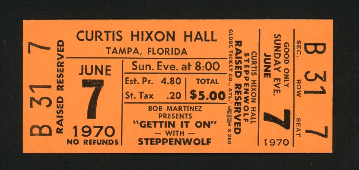 This unused ticket is from a concert by chart-topping Steppenwolf (“Born to be Wild”) at the Curtis Hixon Hall, Tampa, Florida, June 7, 1970.