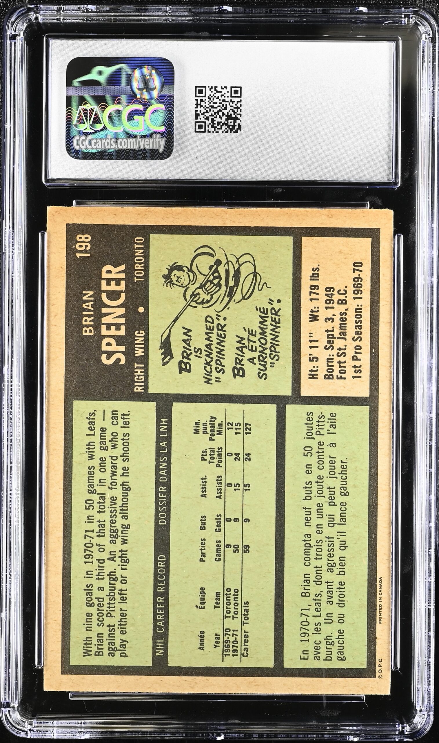 Rookie card of “Spinner” Spencer, a tragic hockey story (Google it).