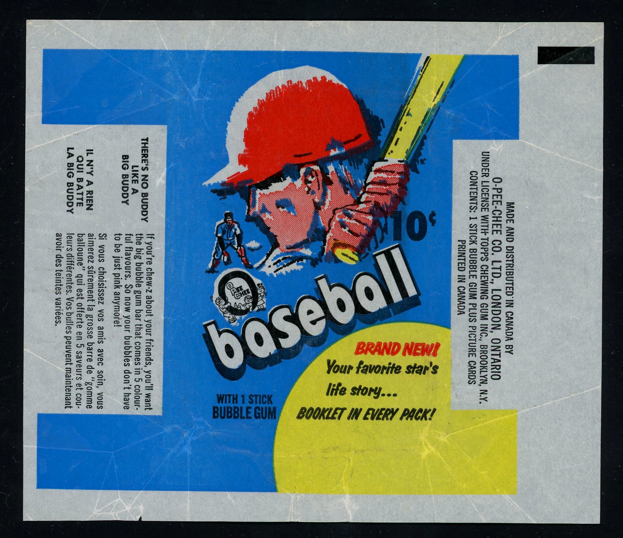 Excellent condition 10-cent O-Pee-Chee baseball wax wrapper from 1971. Wrapper shows normal stress lines, otherwise excellent condition!