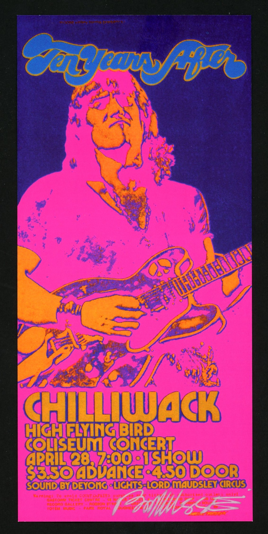 This is a 2nd printing of a handbill promoting an April 28, 1972, concert in Vancouver featuring British rock-blues band Ten Years After, with local acts Chilliwack and High Flying Bird. This 3 3/8″ x 7 1/8″ handbill is signed by the artist, Bob Masse, in silver sharpie.