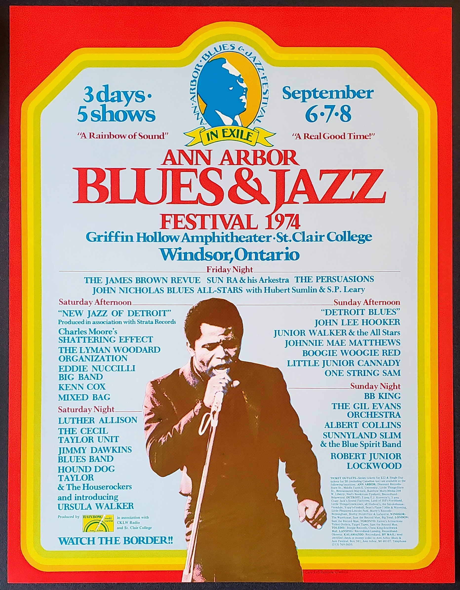 The festival was moved from Detroit to Windsor as the promoters were told they could not hold the event in the city. The three days were jam packed with music, headlined by the James Brown Revue, John Lee Hooker BB King, Albert Collins, Sun Ra and many others.