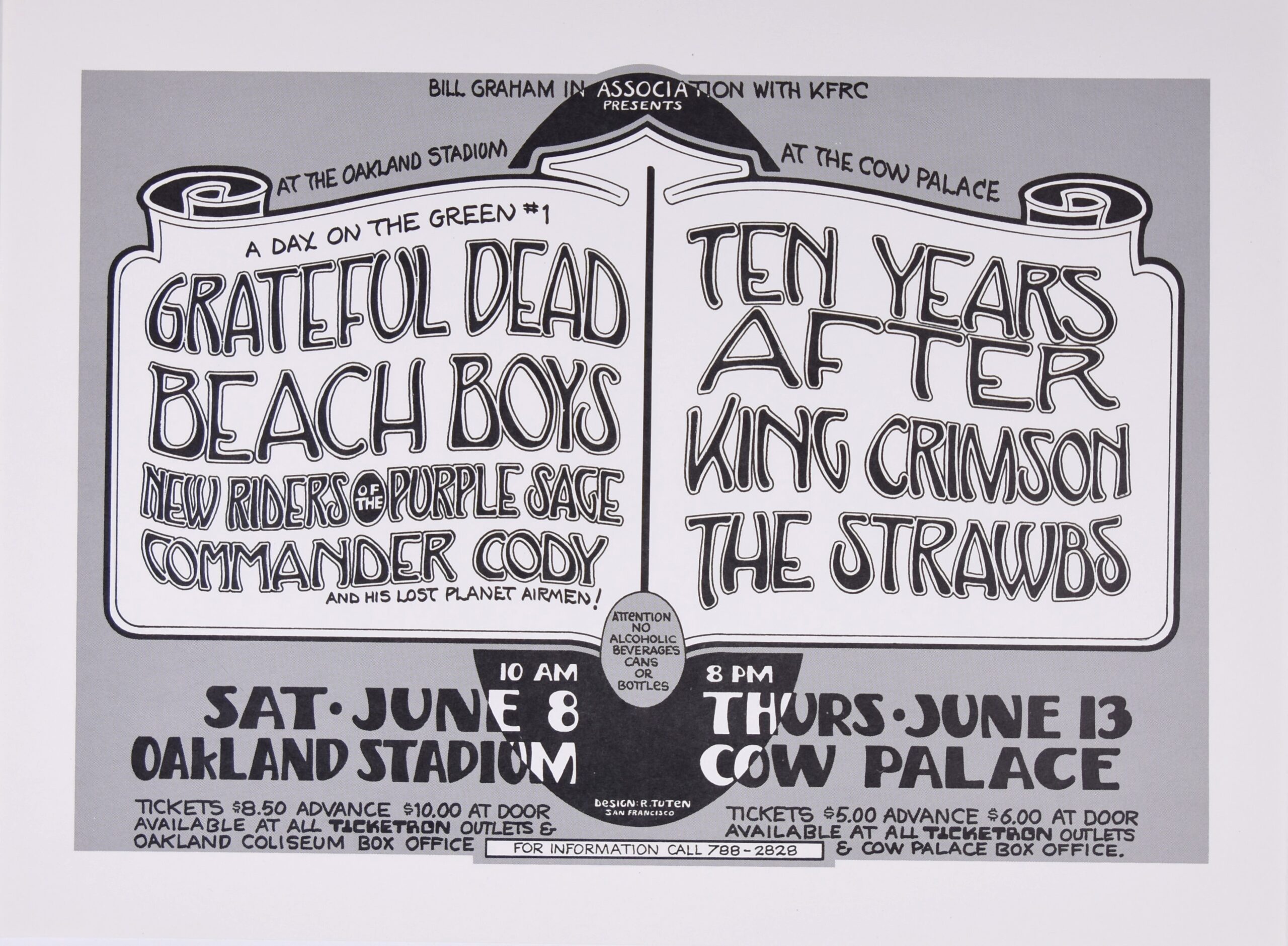 This is an original first-printing poster done to advertise a pair of Bill Graham promoted shows in June of 1974. The first show is the June 8 concert in Oakland, part of the “Day on the Green” series, featuring an eclectic lineup of the Grateful Dead, the Beach Boys, New Riders of the Purple Sage, and Commander Cody and his Lost Planet Airmen. The second show was held June 13 at the Cow Palace in San Francisco and featured Ten Years After, King Crimson and the Strawbs. Art is by Randy Tuten.
