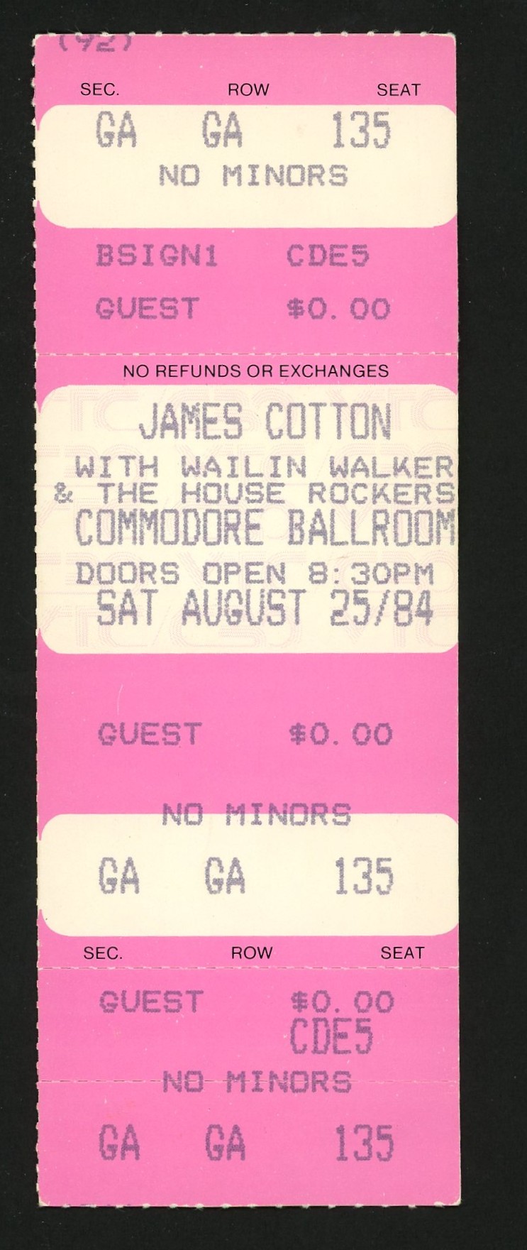 This unused “guest” ticket was for an August 1984 concert at the Commodore Ballroom in Vancouver with blues great James Cotton, and Canadian blues band Wailin’ Walker and the House Rockers.