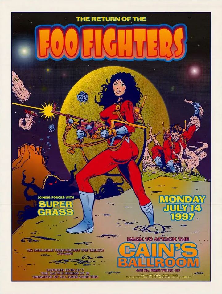 Awesome sci-fi comic art on this large poster promoting a July 1997 show at Cain’s Ballroom in Tulsa, Oklahoma, featuring the Foo Fighters and Super Grass.