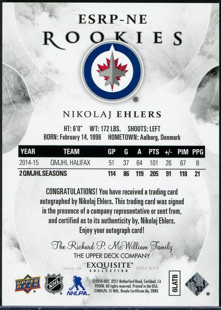2015-16 Upper Deck Nikolaj Ehlers Exquisite Collection Rookie Signatures #31/149