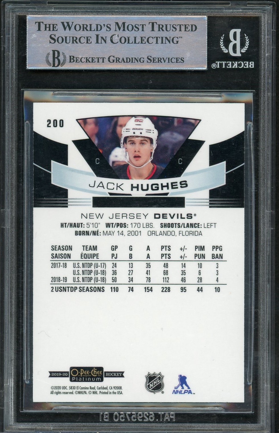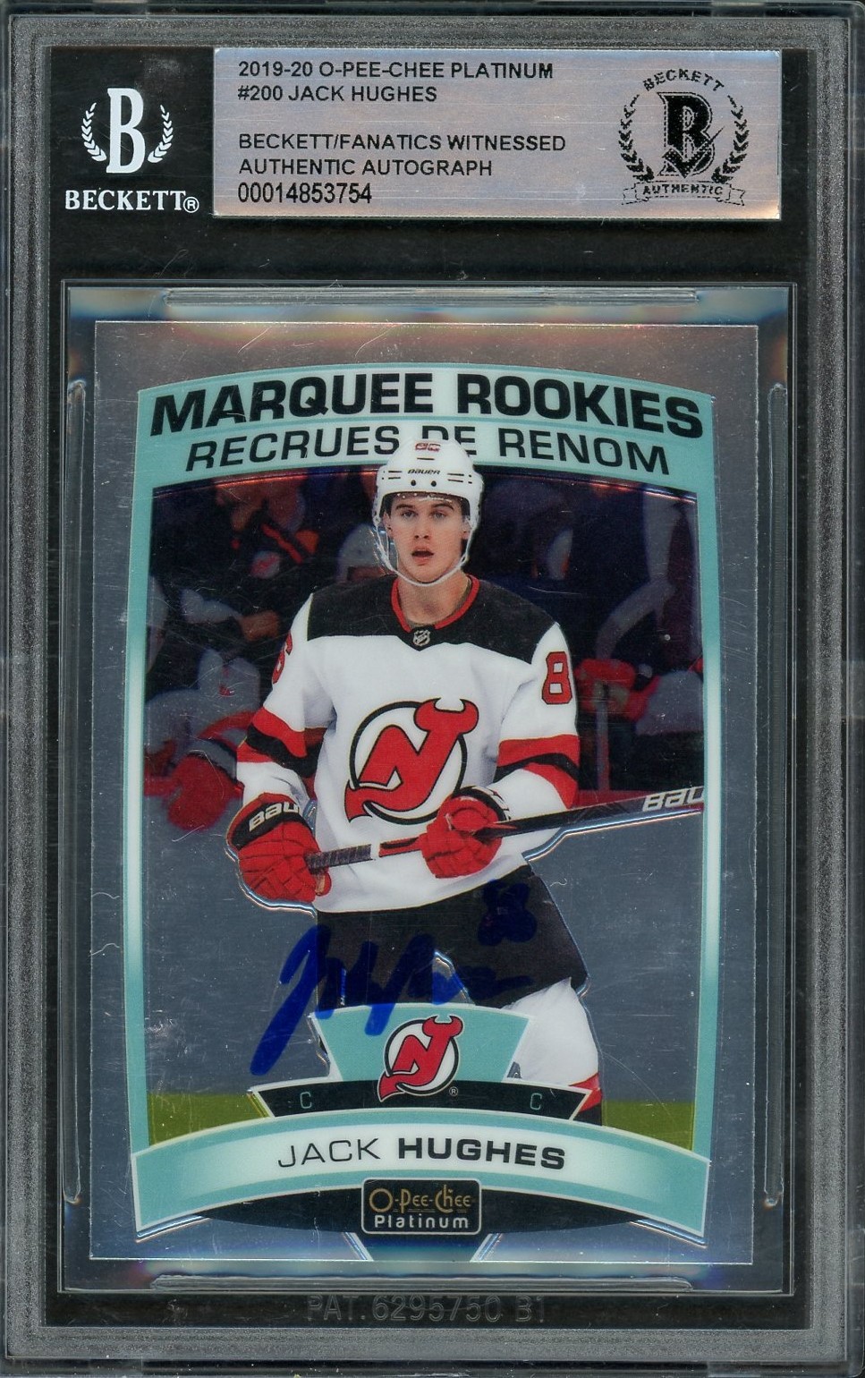 2019 OPC Platinum Marquee Rookies on card in person autograph of Jack Hughes witnessed by Beckett/Fanatics.