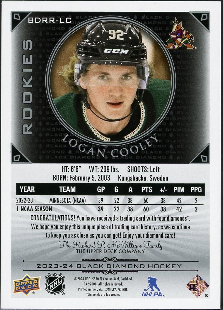 2023-24 Upper Deck Black Diamond Quad Diamond Rookie Relics Logan Cooley #94/99