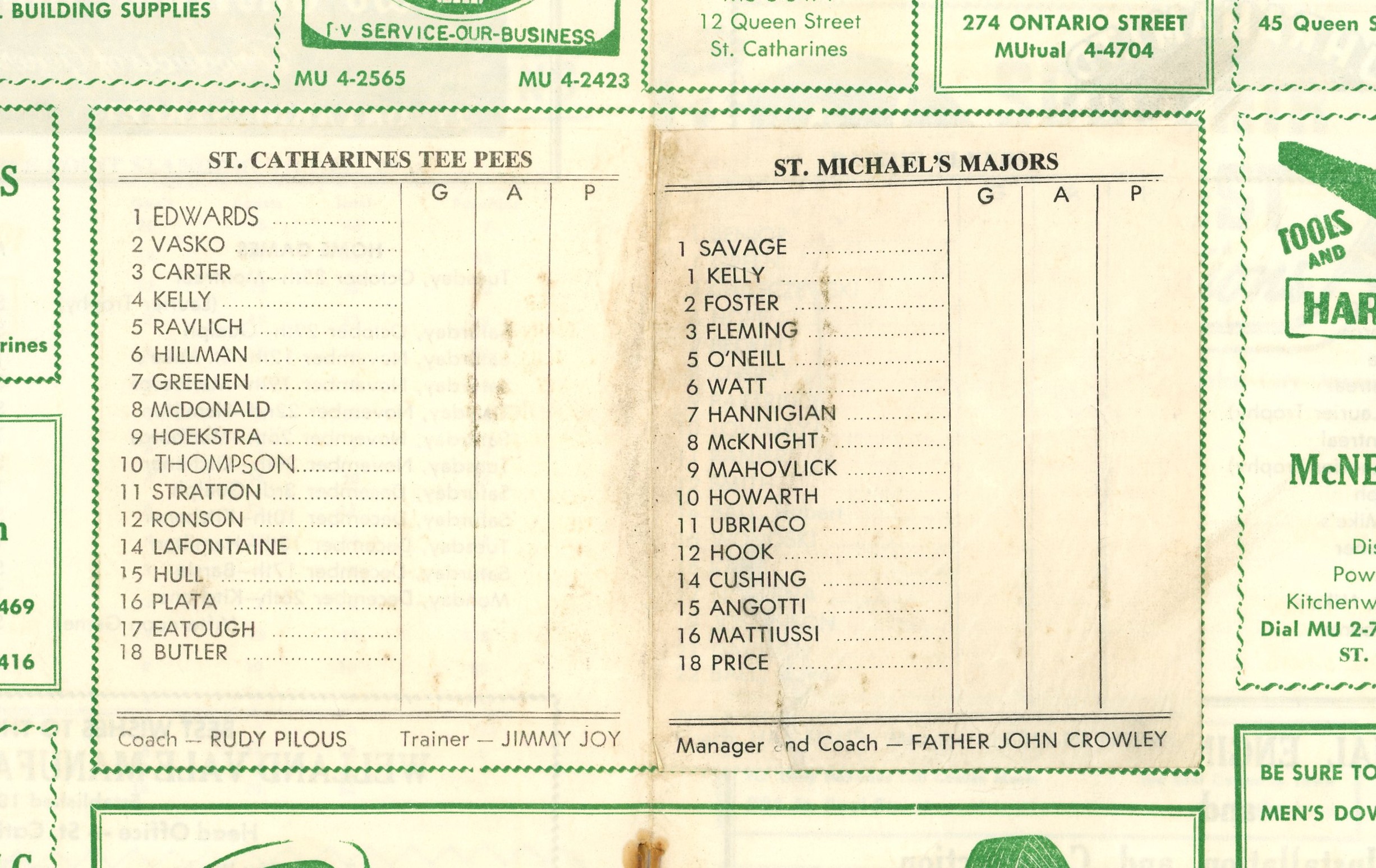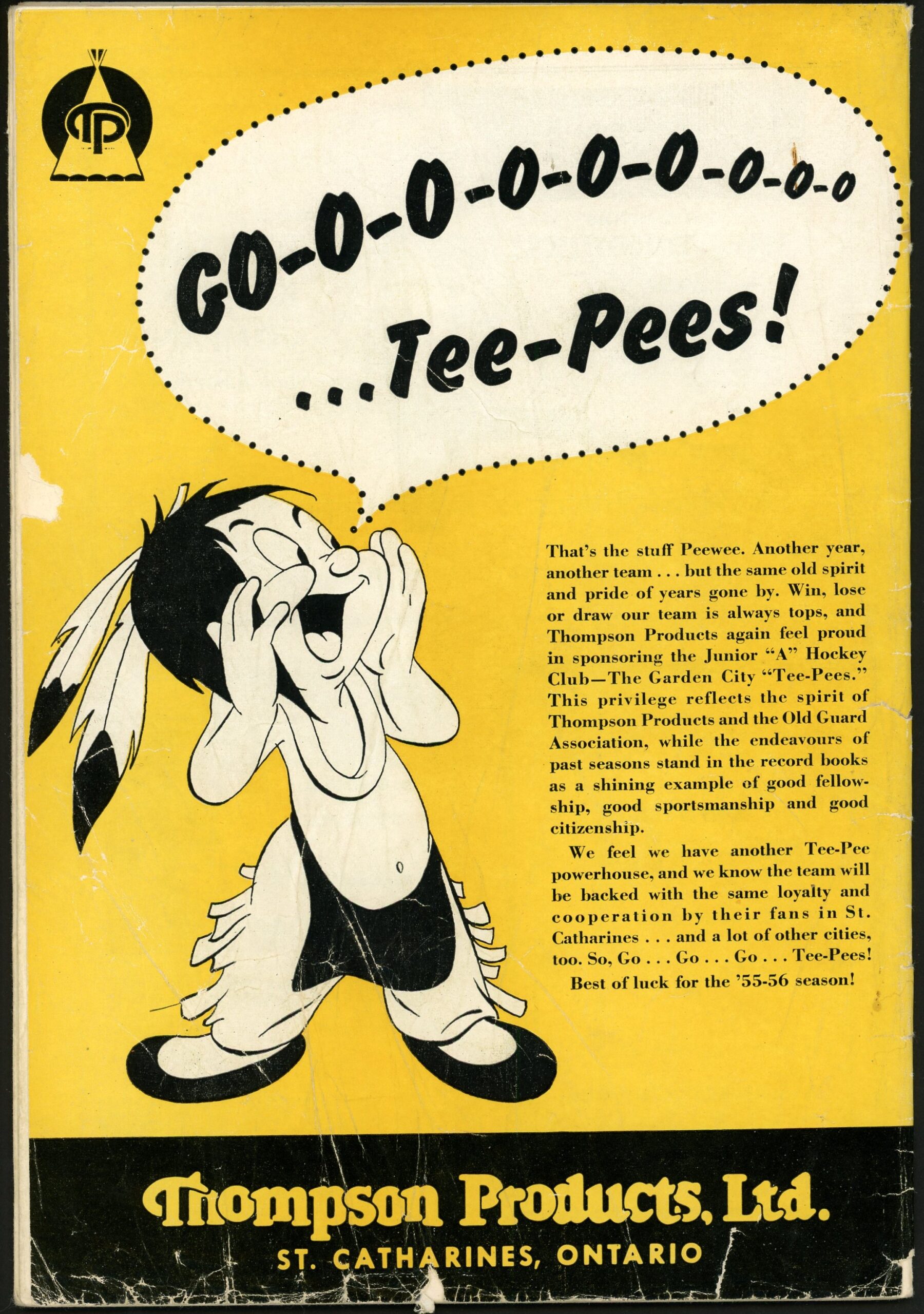 Historically significant junior hockey game program featuring the St. Catharines Tee Pees hosting Toronto’s St. Michael’s juniors, from early in 1956. Many future NHLers dot the rosters, but most importantly you have two teenagers and future Hall of Famers in there. 18-year-old Frank Mahovlich (misspelled “Mahovlick”) is facing off against 17-year-old Bobby Hull. Both had just celebrated birthdays in the days leading up to this game. Over condition is GD, the cover is loose, there is wear, rust to the staples, and other flaws (see scans).