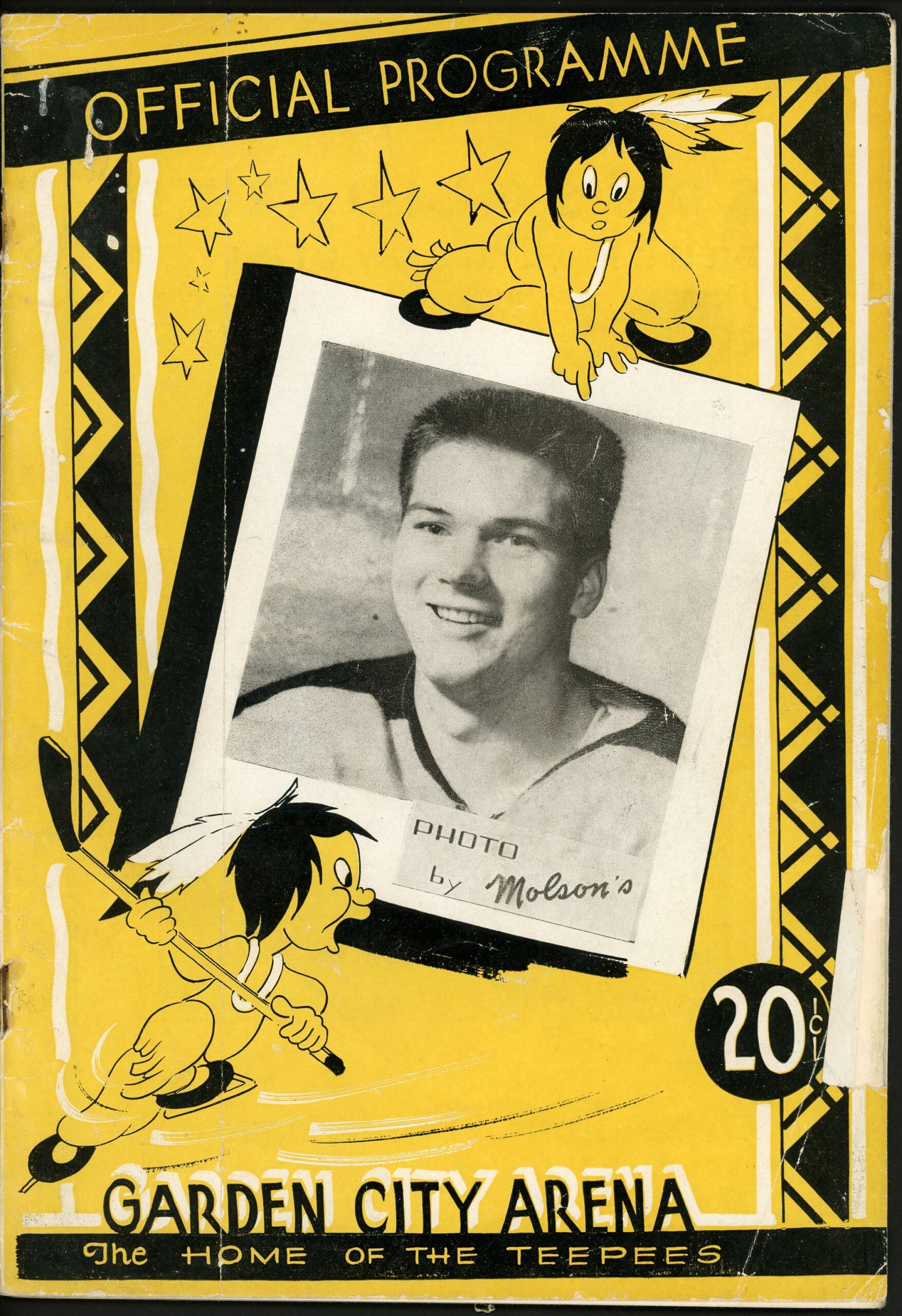 Historically significant junior hockey game program featuring the St. Catharines Tee Pees hosting Toronto’s St. Michael’s juniors, from early in 1956. Many future NHLers dot the rosters, but most importantly you have two teenagers and future Hall of Famers in there. 18-year-old Frank Mahovlich (misspelled “Mahovlick”) is facing off against 17-year-old Bobby Hull. Both had just celebrated birthdays in the days leading up to this game. Over condition is GD, the cover is loose, there is wear, rust to the staples, and other flaws (see scans).